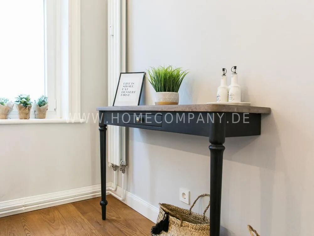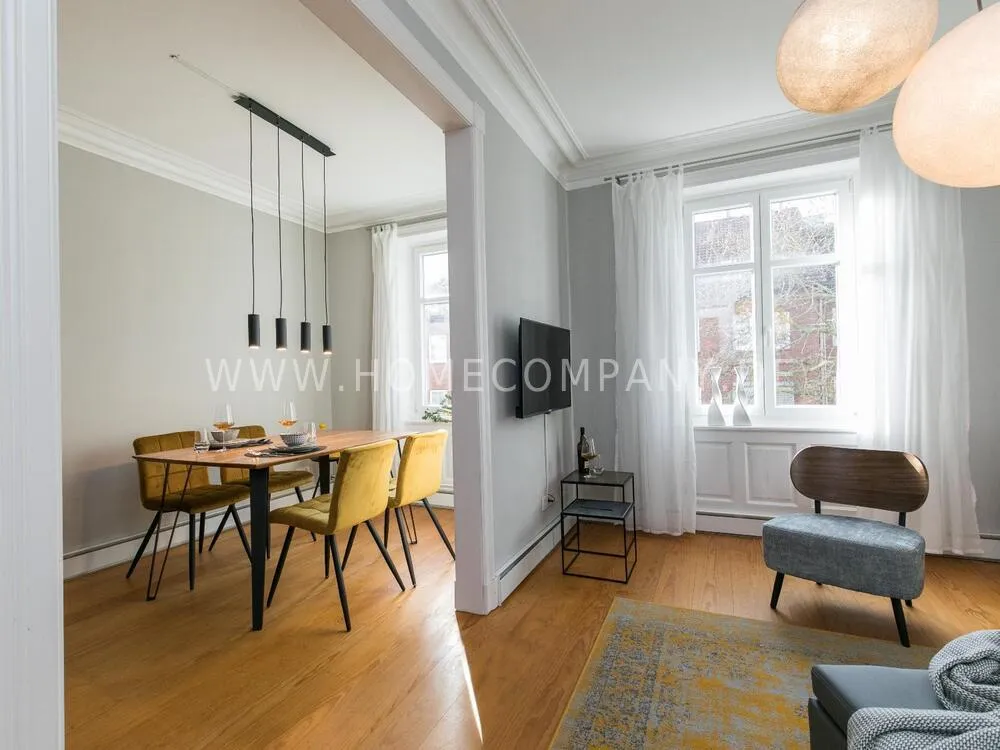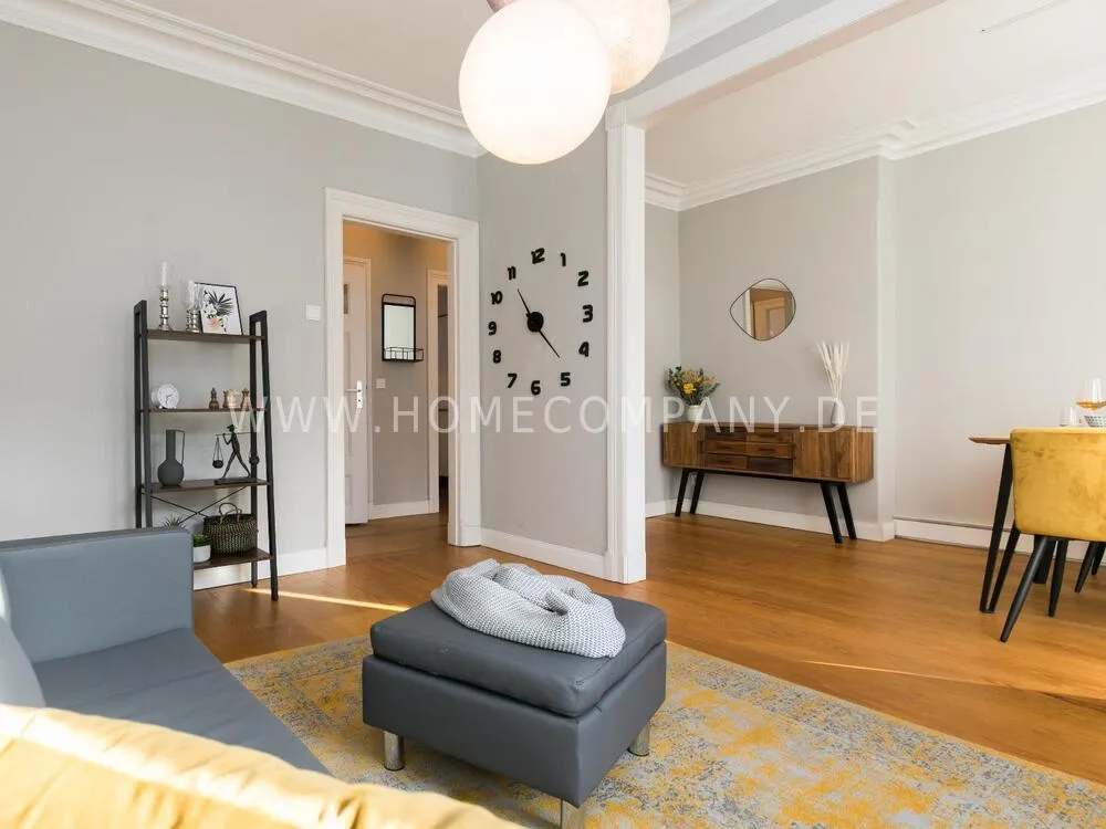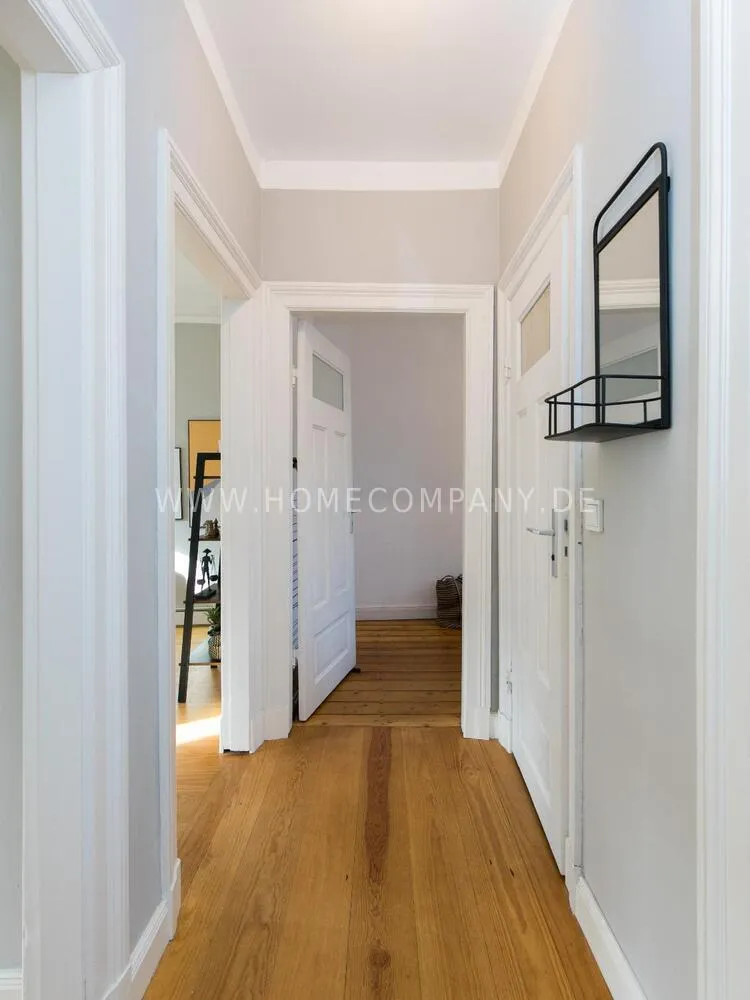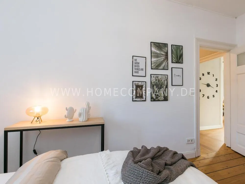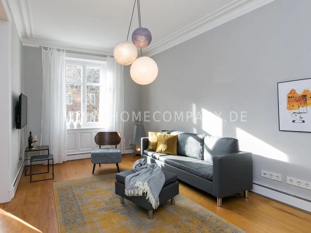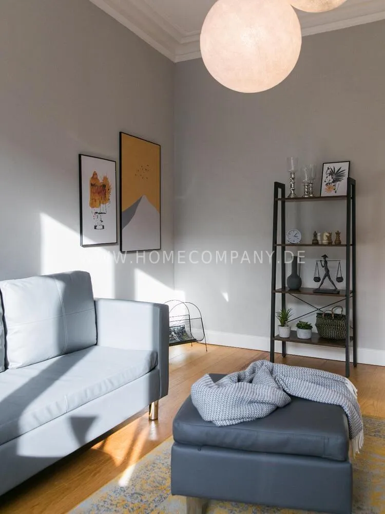 The apartment, newly furnished in 2021, on the quiet edge of the popular Schanzenviertel, impresses with its homely and cozy atmosphere. The skirting board heating ensures pleasant room air and even heat distribution. The Pitchpine-floorboards, the subtle stucco in the living and dining area and the beautiful window cladding also contribute to the feel-good atmosphere.