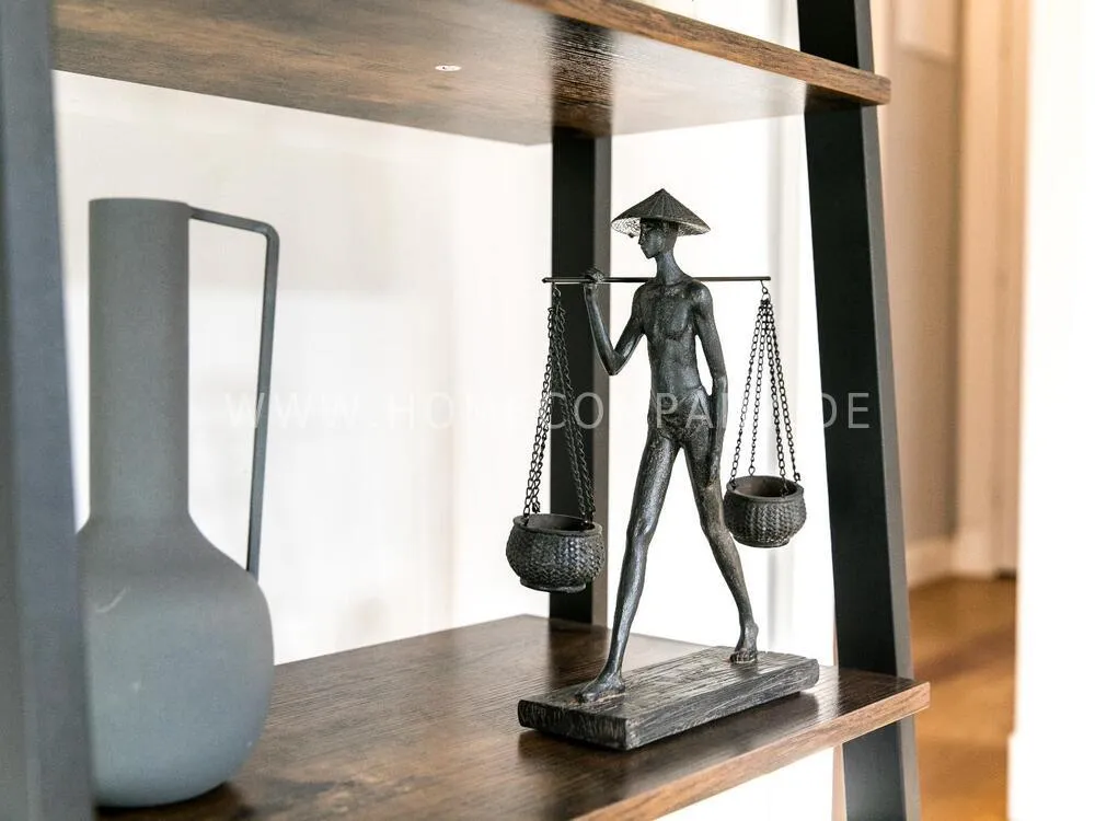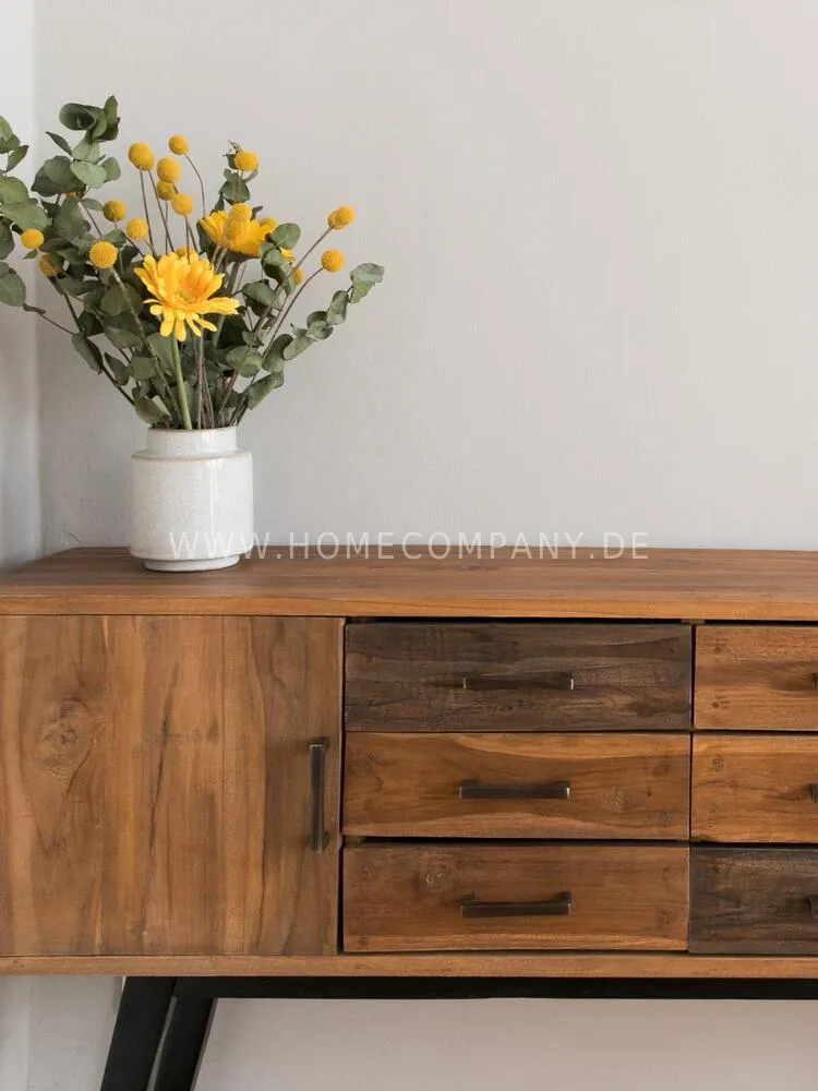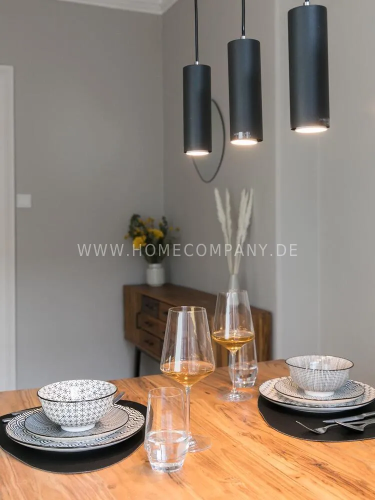 The living room, which is open to the dining room is furnished in light, cozy colors and offers enough space for cozy evenings. The very beautiful, 1.60 m x 90 cm dining table in teak and black is a timeless classic and the cool dining chairs in curry-colored velvet and black metal legs round off the new, trendy and fresh business look.