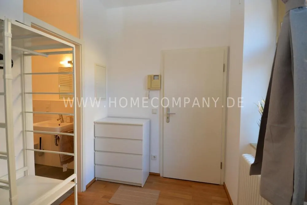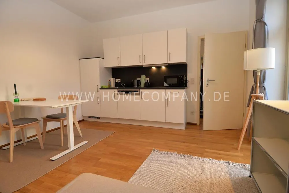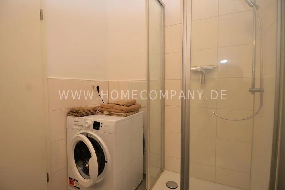 Cozy one-room apartment in a prime location in Potsdam's city center. Beautifully modern tiled bathroom with shower and washing machine. Kitchenette with dishwasher, two-burner cooktop, microwave, and fridge-freezer.