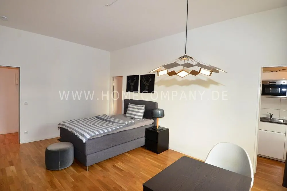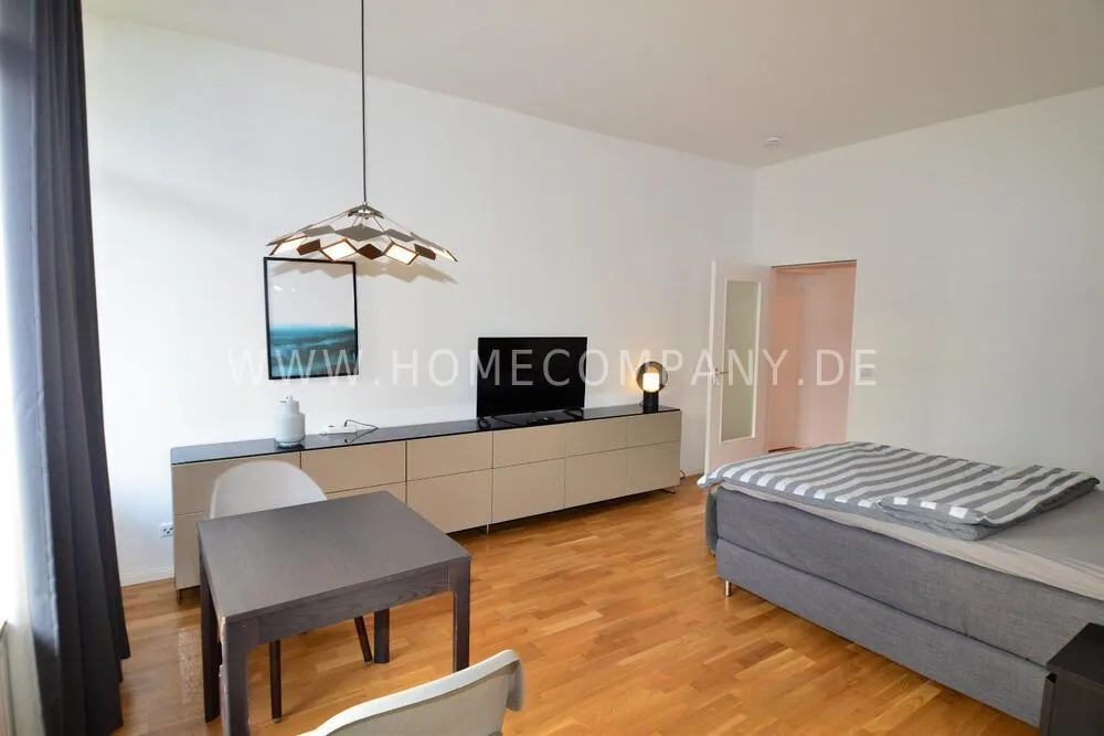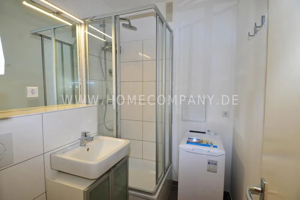 First occupancy! One room apartment in Mitte. Fully furnished with bed, table and washing machine. Modern tiled bathroom with shower. The wardrobe is in the hallway.