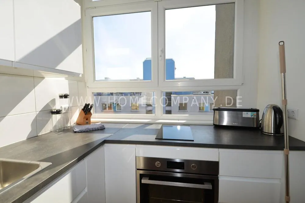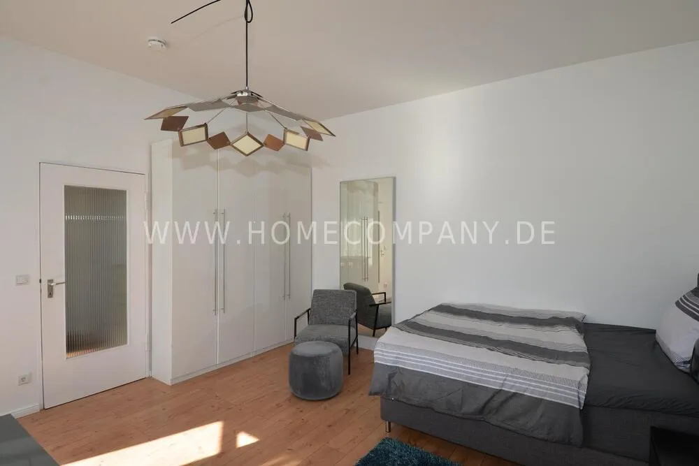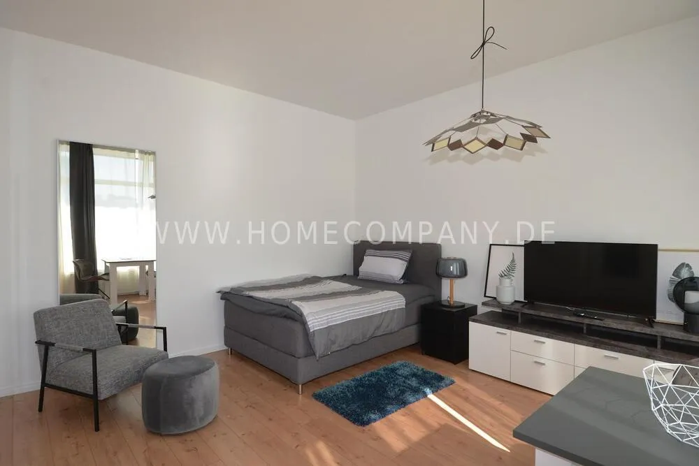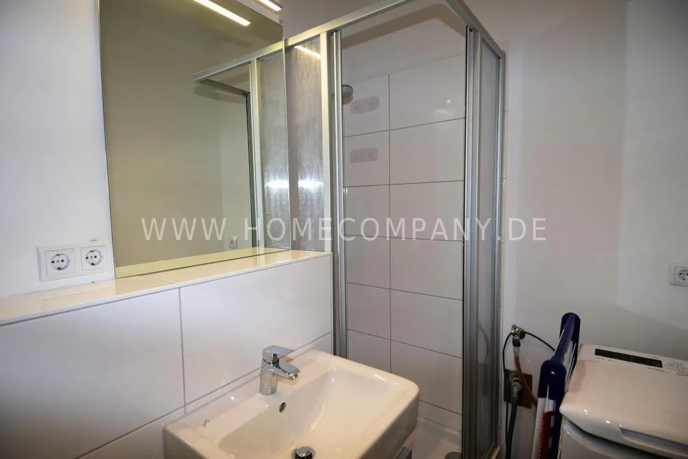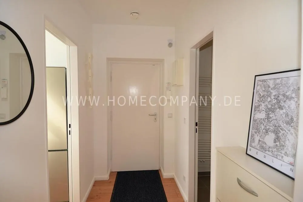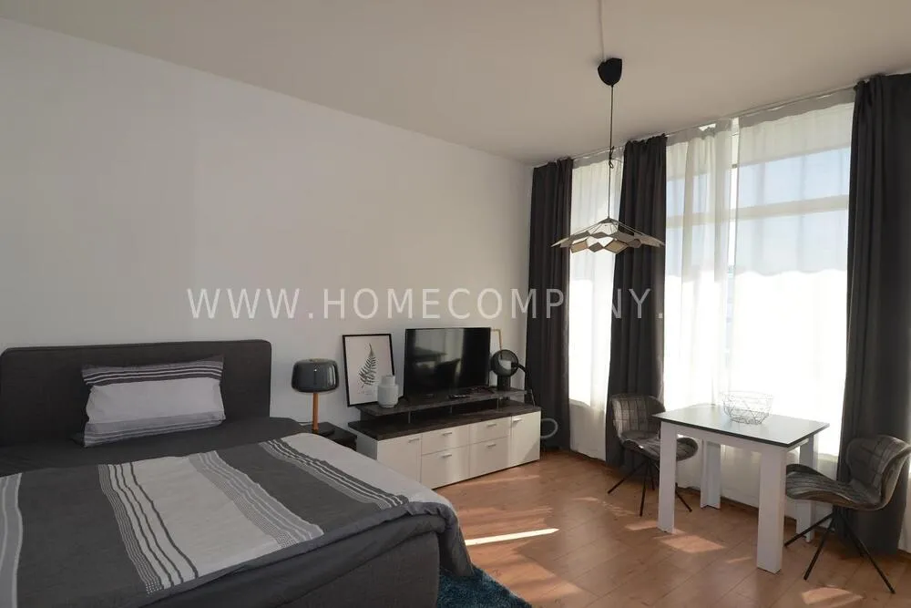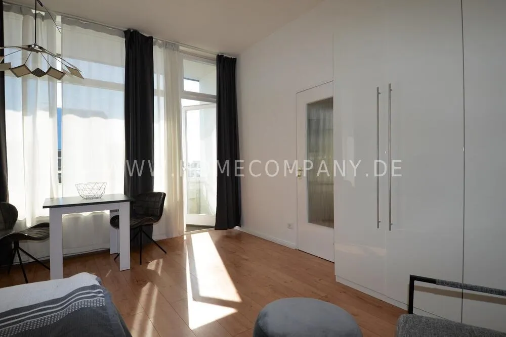 Welcome to this charming one-bedroom apartment in Mitte! Flooded with an abundance of natural light, it offers a bright and inviting atmosphere. The apartment comes fully furnished with a cozy bed, a convenient table, and a washing machine for your comfort. The modern tiled bathroom features a refreshing shower, while the hallway boasts a spacious wardrobe.