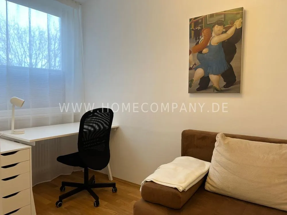 The guest room includes a fully equipped workspace with a desk, drawer unit, and chair, as well as a sofa bed for visitors.