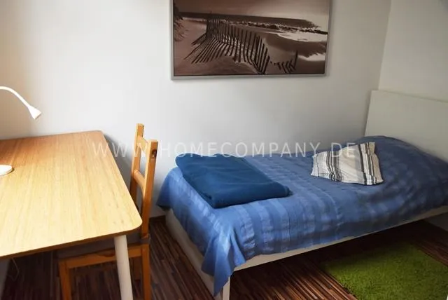 Working/bedroom with single bed 100x200 cm, and table / desk, wardrobe, laminate.