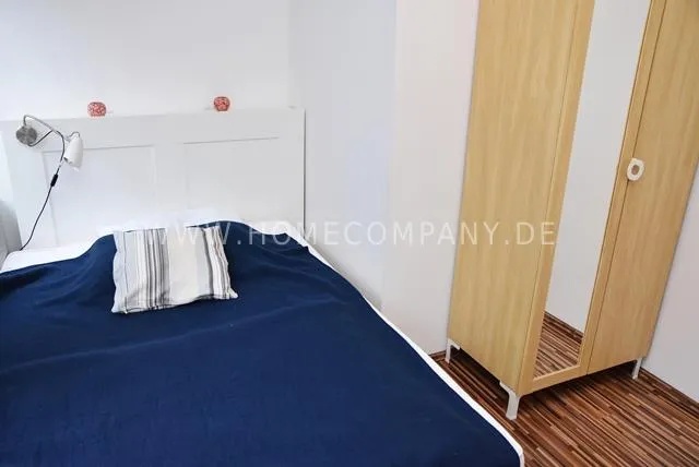 Bedroom with bed 140 cm, wardrobe, laminate.