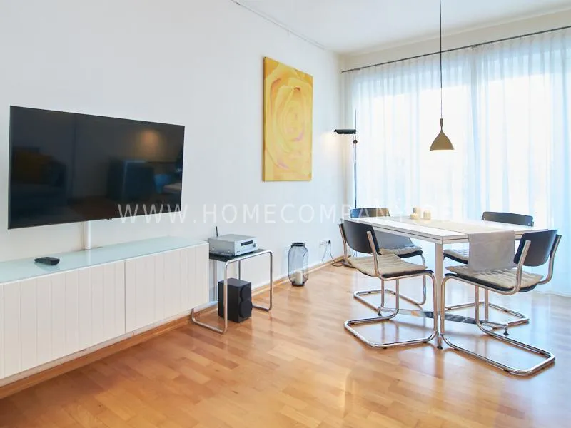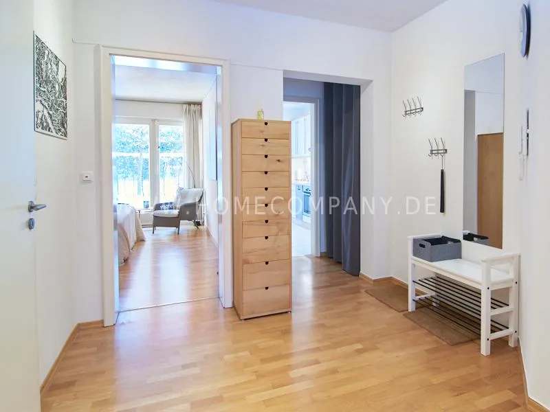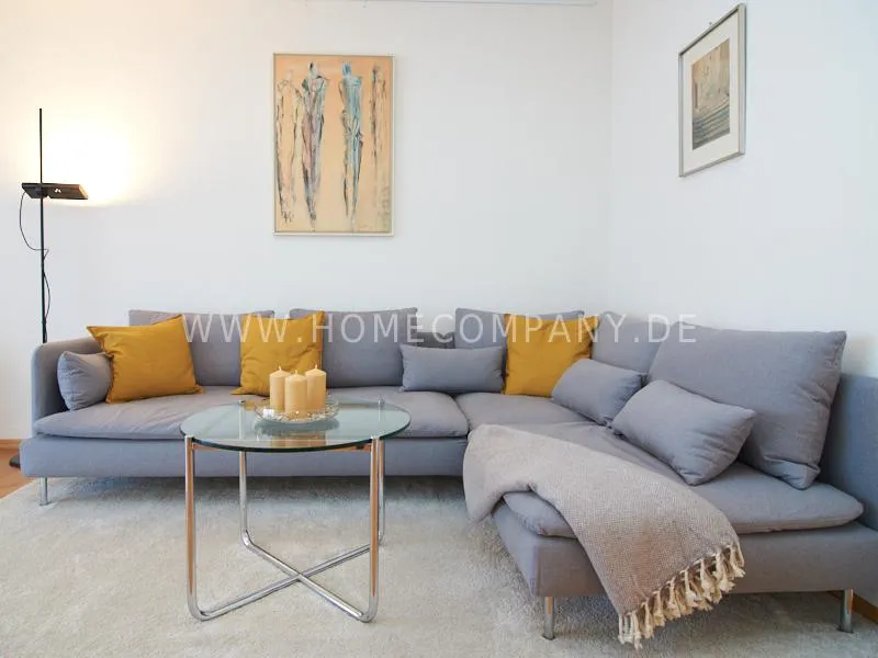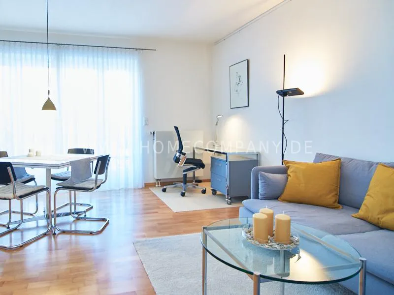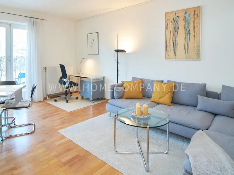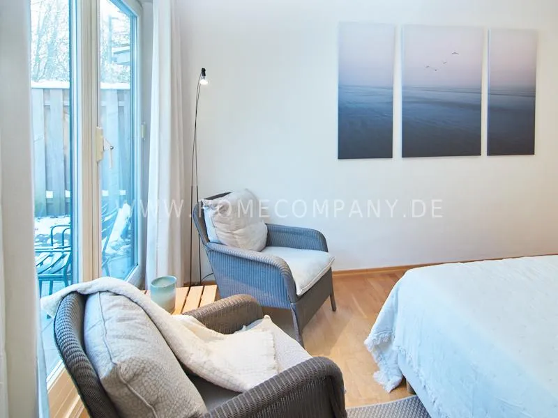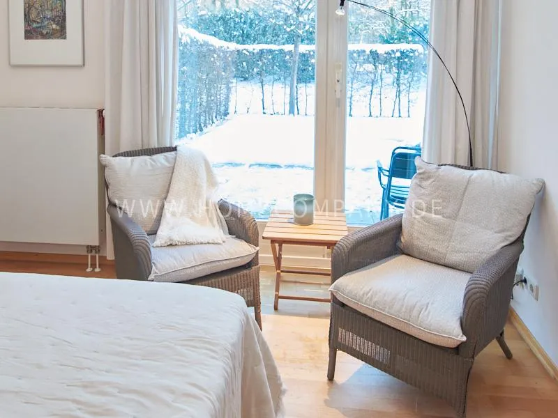 The apartment is located in a small gated community. From the grounds of the residential complex leads directly to the Stadtpark, which can be used like a large garden. The apartment has a large living room with west facing terrace and a bedroom with a further terrace facing east. The kitchen has an additional access to the East Terrace. There you can enjoy a beautiful view over the communal gardens. A small area is protected from rain. The spacious living room has a cozy sitting area, dining area and an additional sofa bed. The spacious living room is equipped with a comfortable sofa area and a dining table. There is an area in the apartment for the home office.