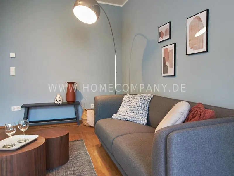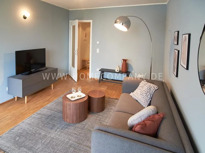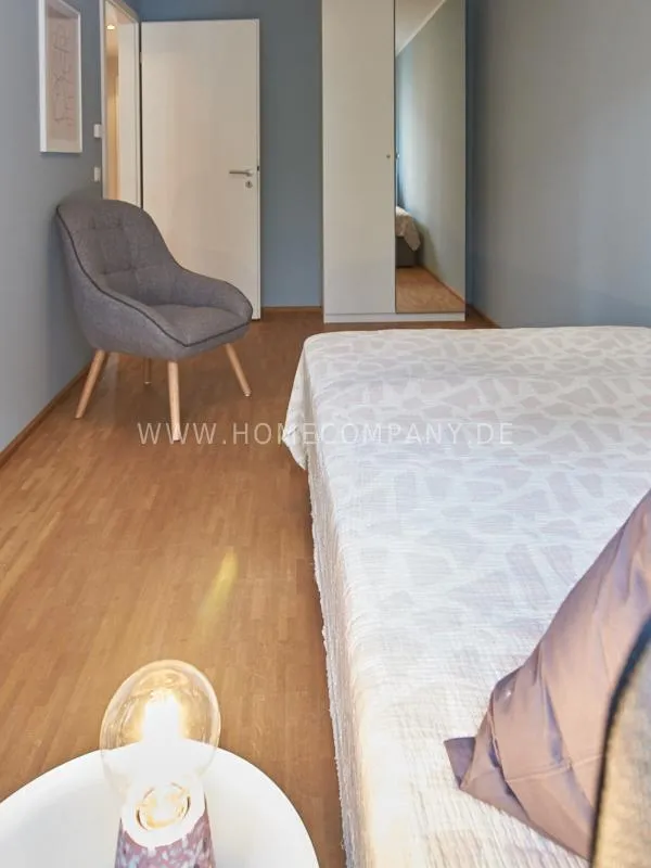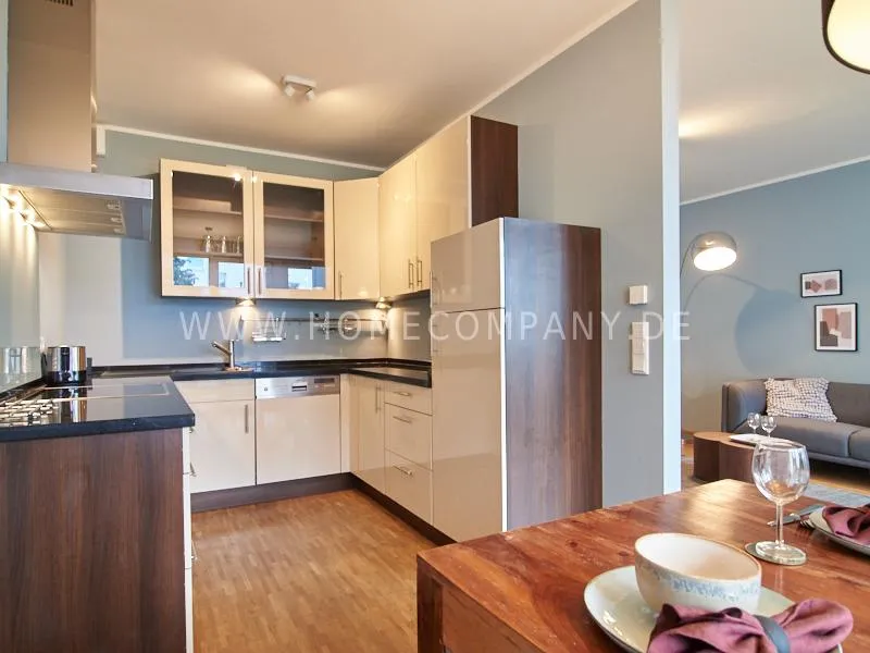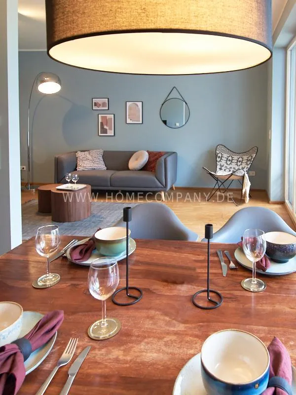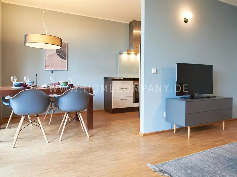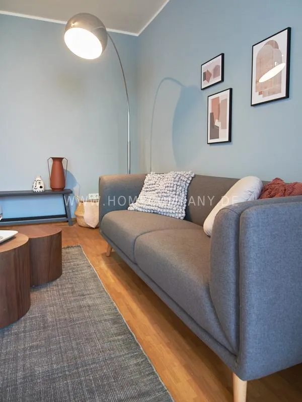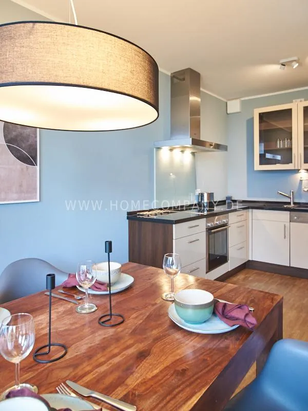 Peace and serenity in a very beautiful, quiet location in chic Winterhude. Classic design meets inviting comfort. The smoky tones are loosened up by elements made of wood and high-quality textiles and give warmth. The exclusive coloring lets the pieces of furniture shine and thus ensures a noble, round overall ambience. A smoky blue and delicate gray harmonize perfectly with each other and structure the apartment in different areas. The living room with adjoining dining area and open kitchen, which faces the beautifully designed backyard, invites you to linger. A large window front overlooks the balcony. The bedroom has a 1.60 m wide box spring bed and plenty of closet space. Another room can be used variably as a guest or children's room. The full bath has a bathtub and an additional separate shower. The apartment is suitable for a single person, a couple or 2 colleagues. The underground parking space and the baoardcast fee are included.