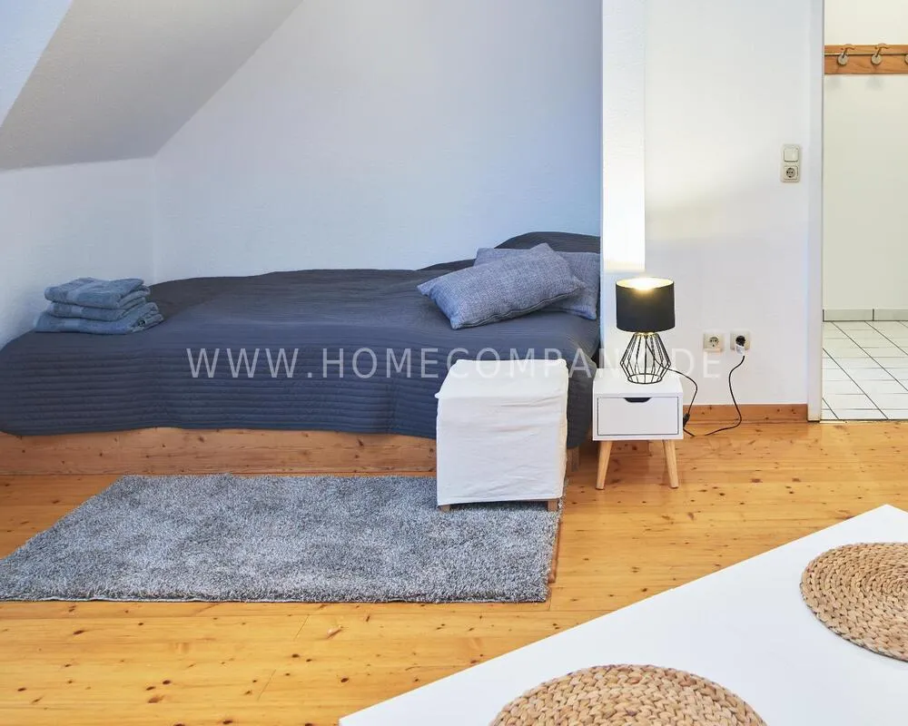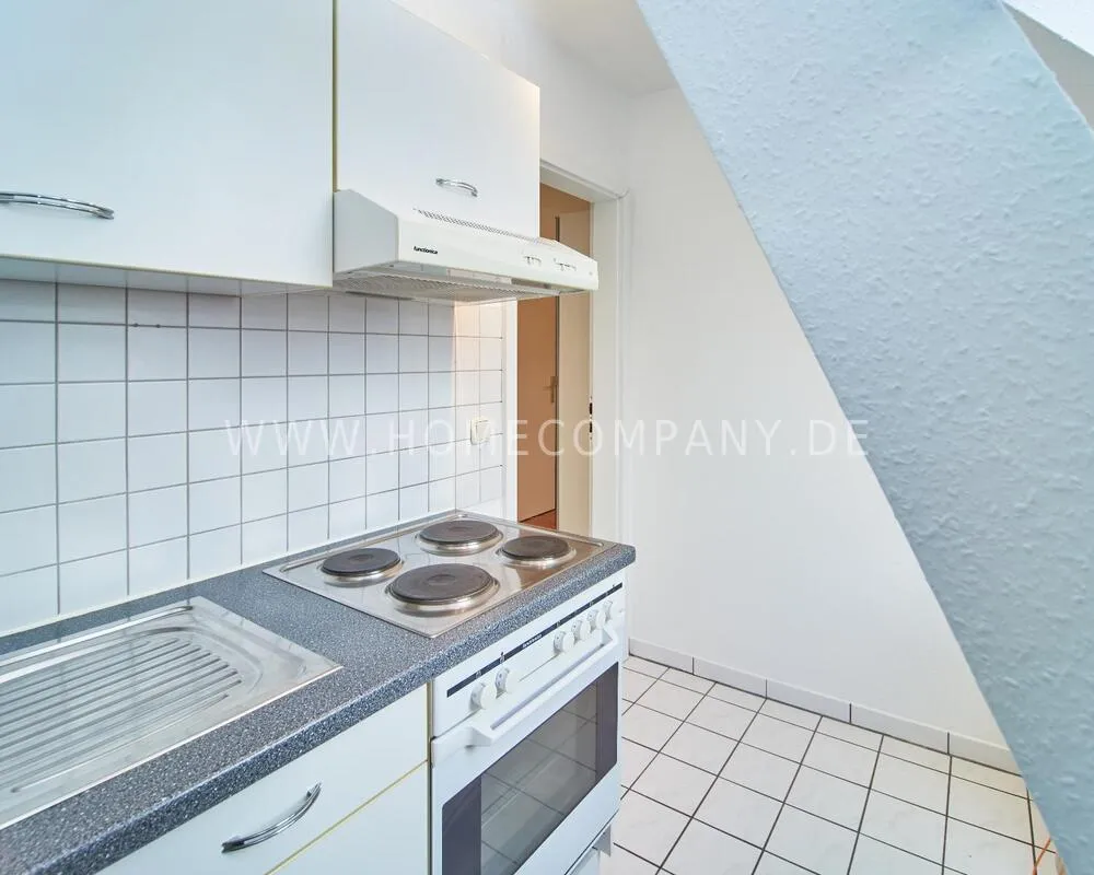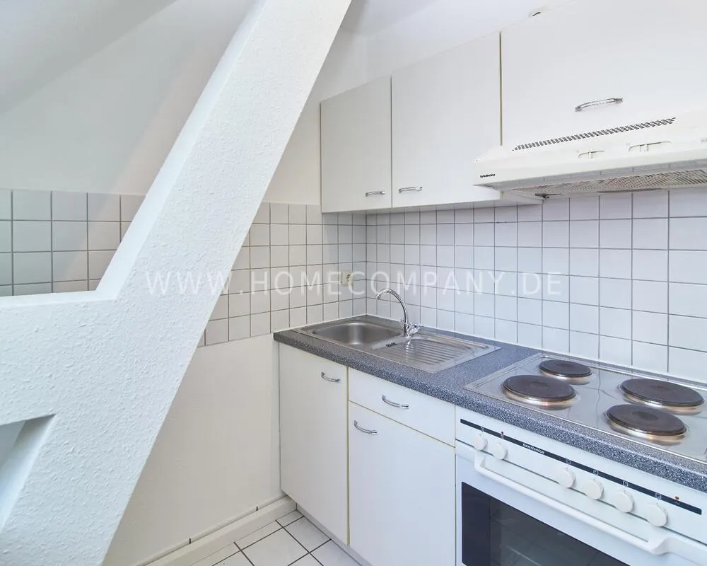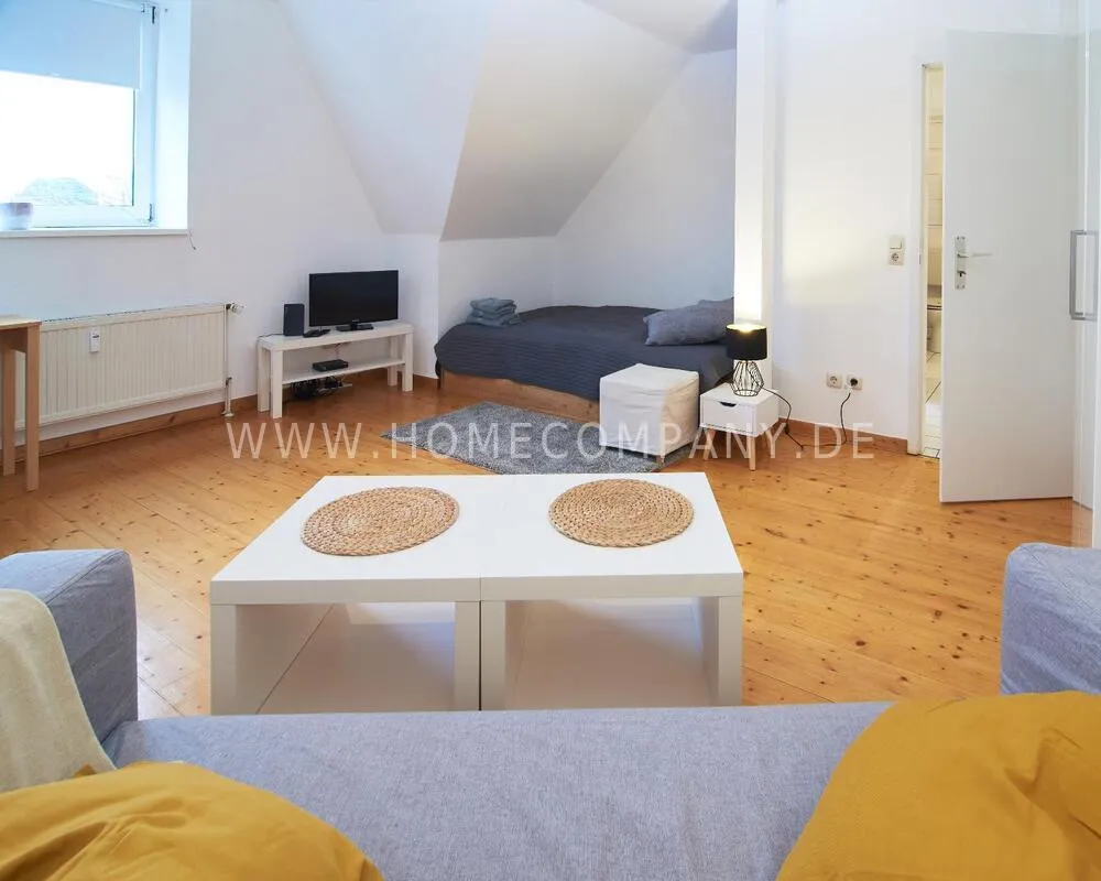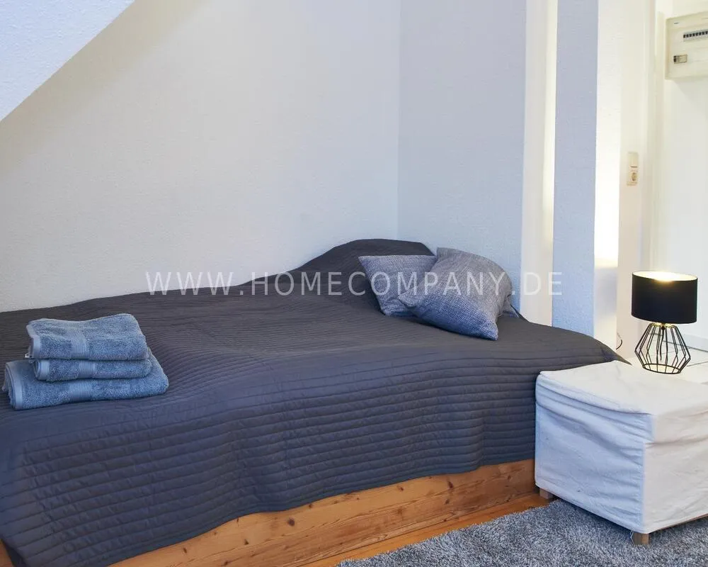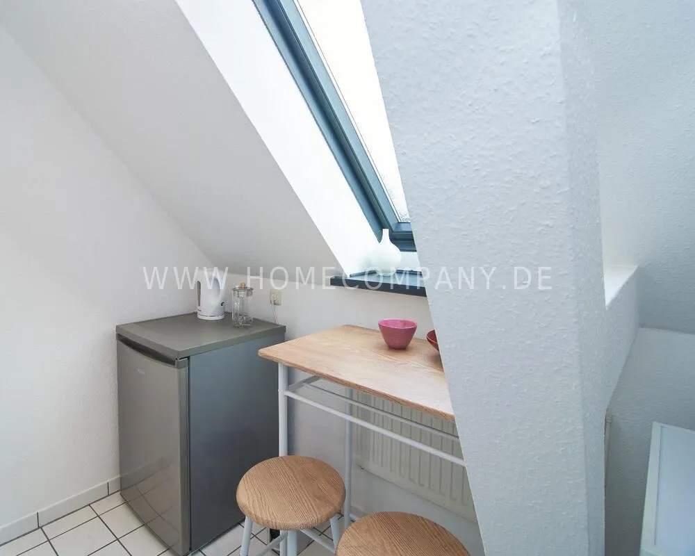Attic apartment (1 person usage only) with a wide view over the rooftops of Hamburg. The apartment is equipped with a sofa and a 1.20 m wide bed. There is a counter table in the separate kitchen.