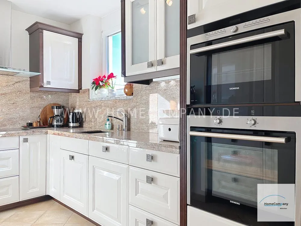 It includes a built-in oven with pull-out trays, a separate microwave, a ceramic 4-burner cooktop, and a Siemens dishwasher.