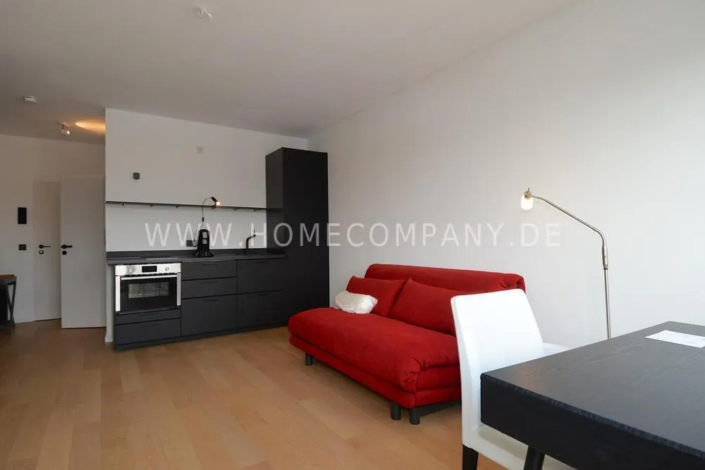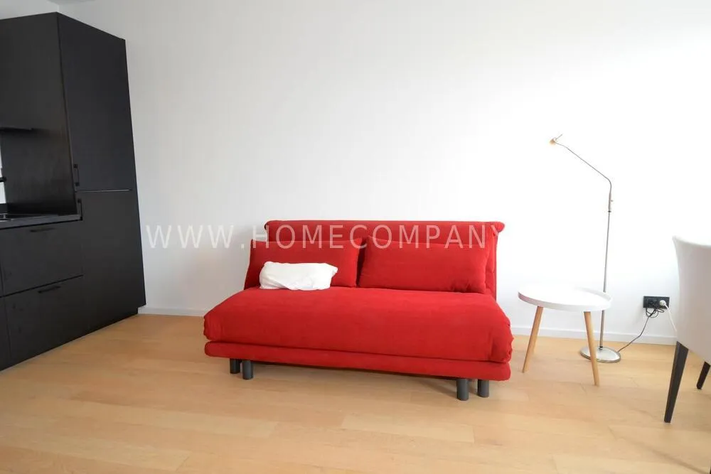 The apartment has a black built-in kitchenette with refrigerator, built-in stove, hob, (no dishwasher) red sofa bed, black desk. white upholstered chair, white sideboard, black wardrobe. open shelf, comfortable armchair.