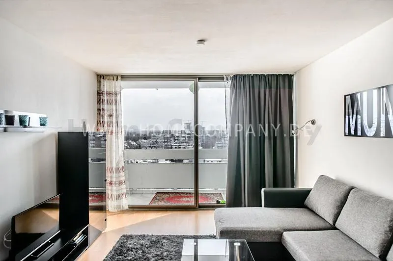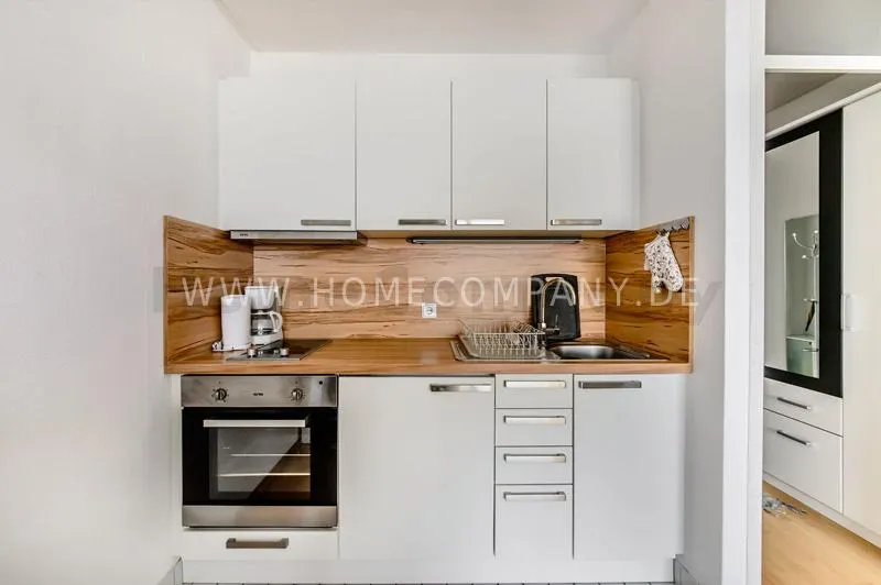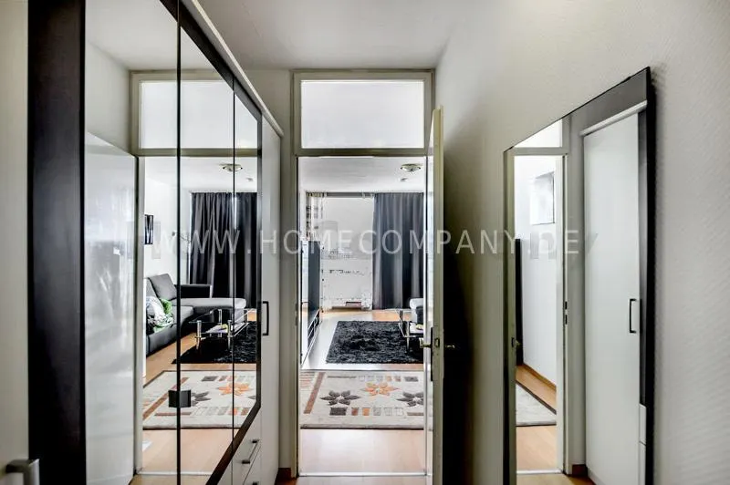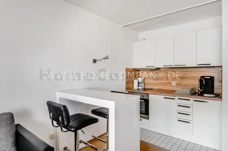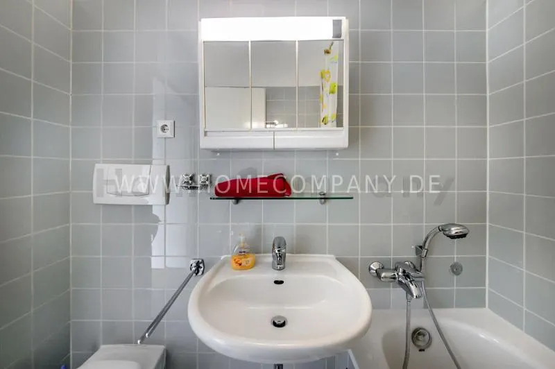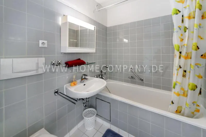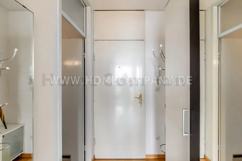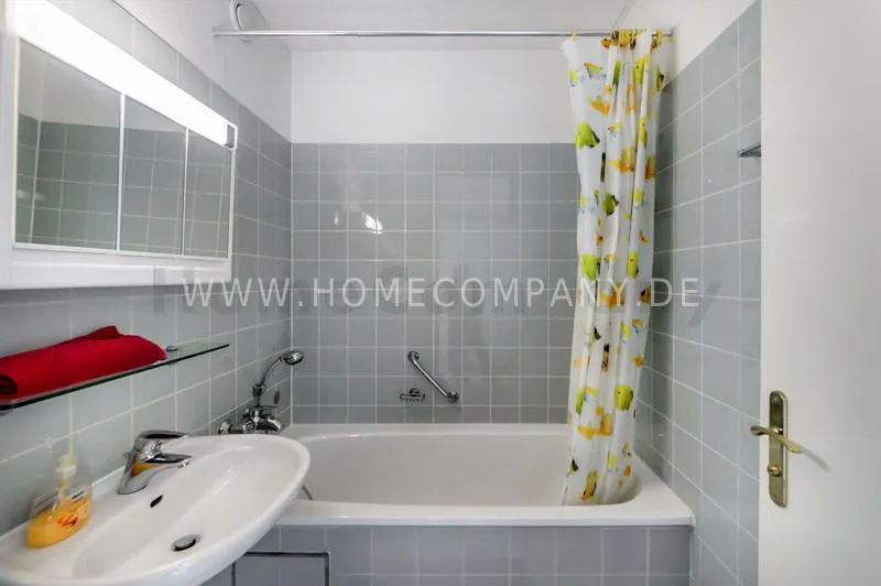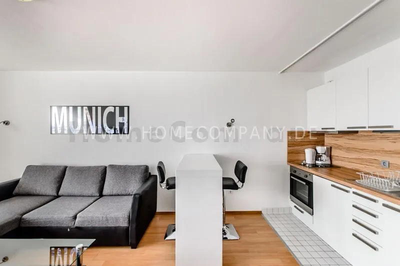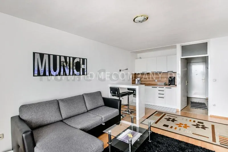 Bright newly refurbished furnished and spacious apartment with loggia in the Arabella Park. 12th floor with elevator. Large panoramic window with mountain view. Quietly located facing south overlooking the garden. Combined living and sleeping area with sofa bed, kitchen, hallway, bathroom and cellar. Flooring: laminate flooring and tiles. Floor heating. Fully equipped new kitchen with fridge, ceramic hob, oven, coffee maker, kettle and complete dishes and cooking set. Dining area with breakfast bar and stools. The tiled bathroom has a shower-bathtub. All kind of shops and restaurants at Rosenkavalierplatz (300m) in the immediate vicinity. Very good transport links (200 m) such as metro (last stop U4 Arabella Park), buses and trams. Shared washing machine/dryer available for a surcharge. The rooftop swimming pool can be used by the residents of the house from April to October. Internet flatrate included.