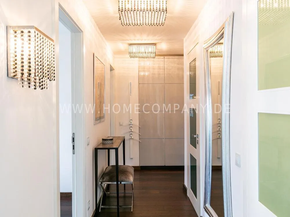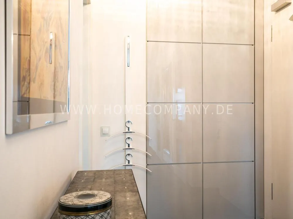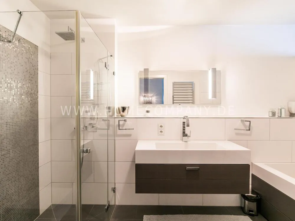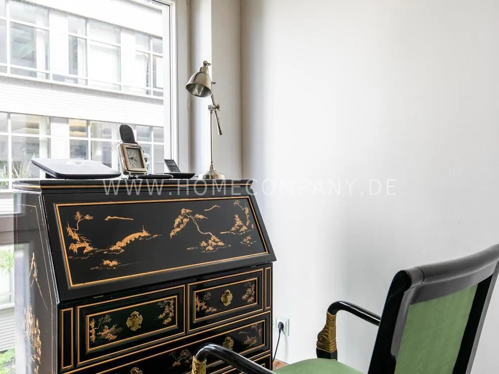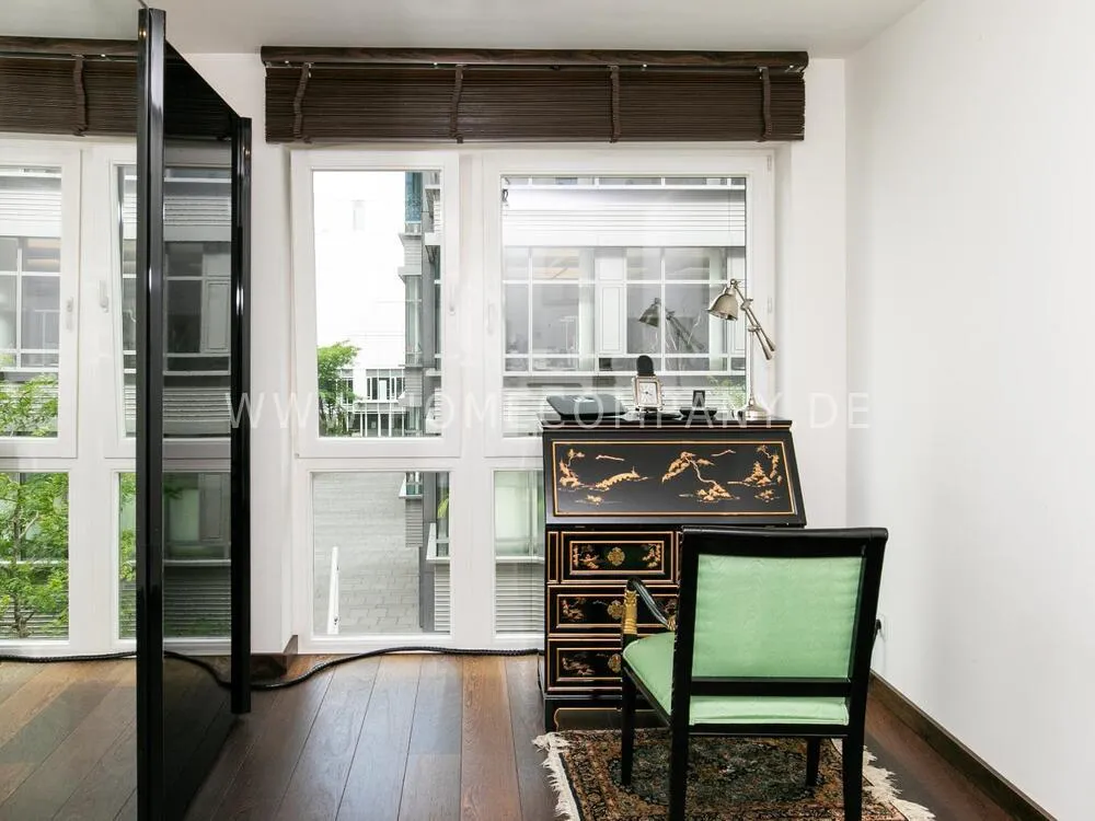 Elegant, modernly furnished 3-room new flat with west-facing balcony in Hamburg-Hafencity. The flat has approx. 86 sqm of parquet flooring and is on the 2nd floor with elevator. From there you have a beautiful view of the museum harbor and the green area of Sandtorpark. In addition, all windows have electric external sun protection. An underground parking space can be rented optionally. A bicycle parking space in the basement can be used. The living room has large glass fronts to the balcony and is fully equipped. The room is furnished with a white leather sofa set (sofa and armchair), a coffee table, a large flat-screen TV and an MP3 docking station. The high-quality, open kitchen has a dining counter and 3 bar stools. The bedroom has a large double bed (180x200 cm) and a wardrobe. The study is furnished with a secretary, a matching chair and another wardrobe. The bathroom has a bathtub, a separate shower, toilet and underfloor and towel heating. A glass window was installed above the bathtub to provide more daylight. The washing machine is in the storage room. The furnished flat is suitable for a maximum of 2 people. An internet connection (WiFi) can be used. Regular cleaning is included and takes place once a week (2 hours). An underground parking space can be rented for EUR 150.00 per month.