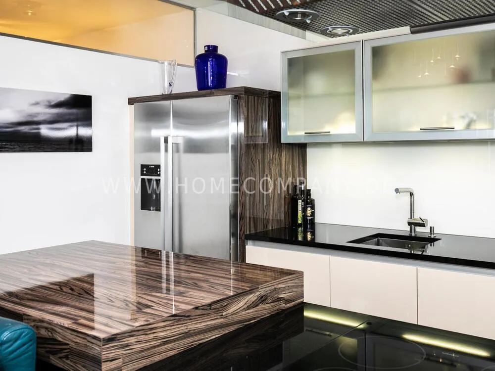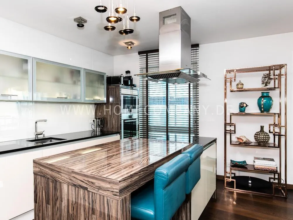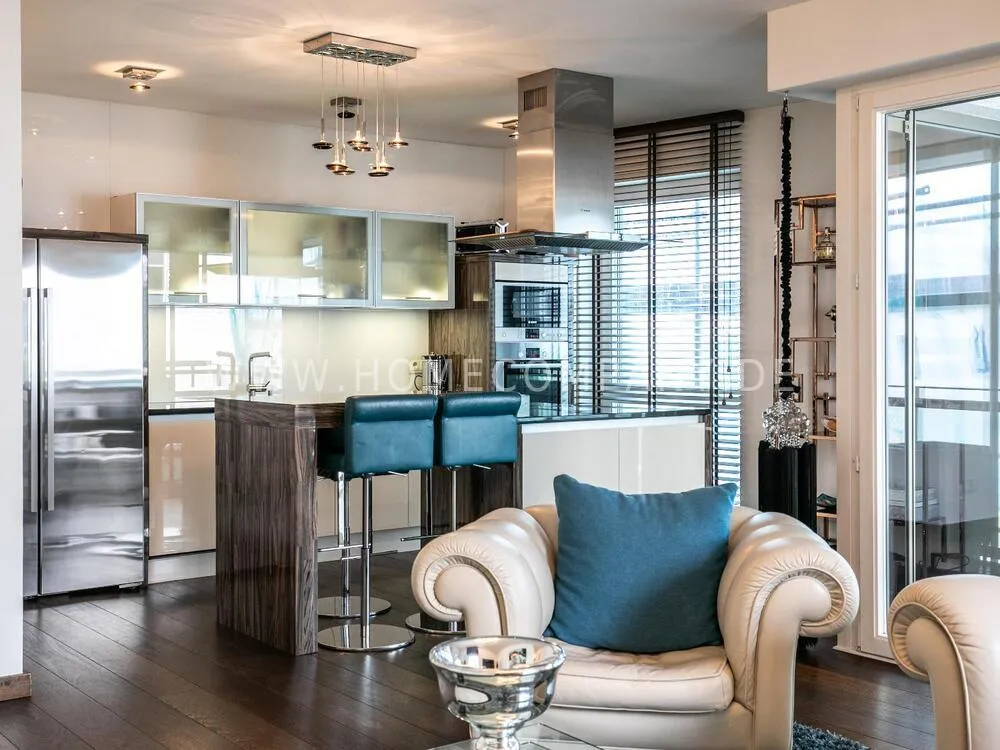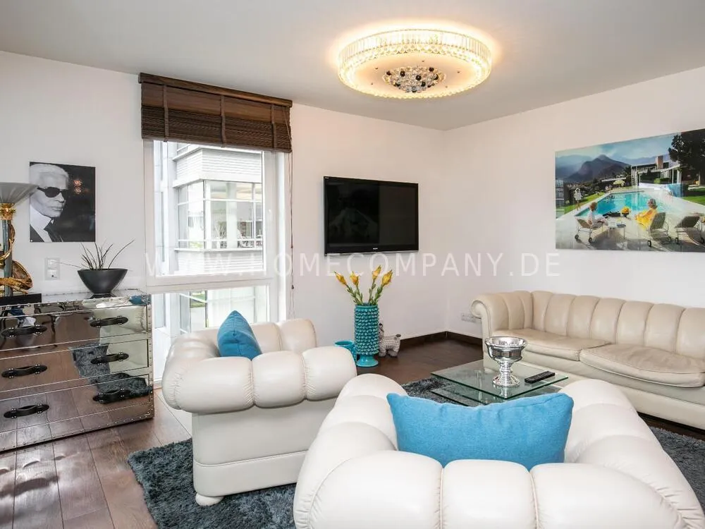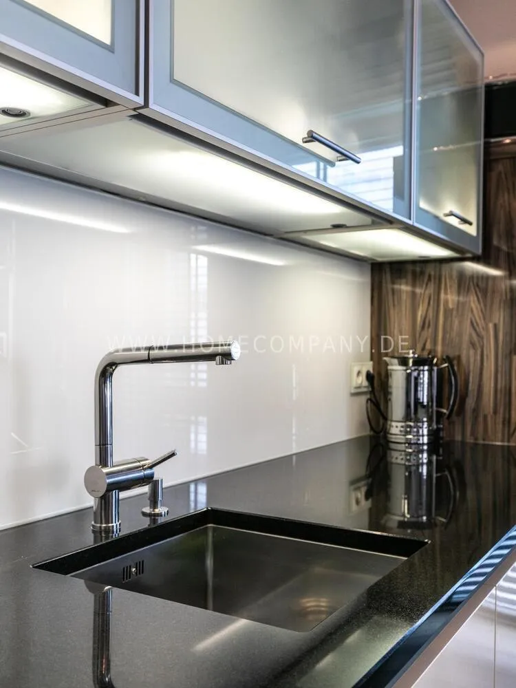 Elegant, modernly furnished 3-room new flat with west-facing balcony in Hamburg-Hafencity. The flat has approx. 86 sqm of parquet flooring and is on the 2nd floor with elevator. From there you have a beautiful view of the museum harbor and the green area of Sandtorpark. In addition, all windows have electric external sun protection. An underground parking space can be rented optionally. A bicycle parking space in the basement can be used. The living room has large glass fronts to the balcony and is fully equipped. The room is furnished with a white leather sofa set (sofa and armchair), a coffee table, a large flat-screen TV and an MP3 docking station. The high-quality, open kitchen has a dining counter and 3 bar stools. The bedroom has a large double bed (180x200 cm) and a wardrobe. The study is furnished with a secretary, a matching chair and another wardrobe. The bathroom has a bathtub, a separate shower, toilet and underfloor and towel heating. A glass window was installed above the bathtub to provide more daylight. The washing machine is in the storage room. The furnished flat is suitable for a maximum of 2 people. An internet connection (WiFi) can be used. Regular cleaning is included and takes place once a week (2 hours). An underground parking space can be rented for EUR 150.00 per month.
