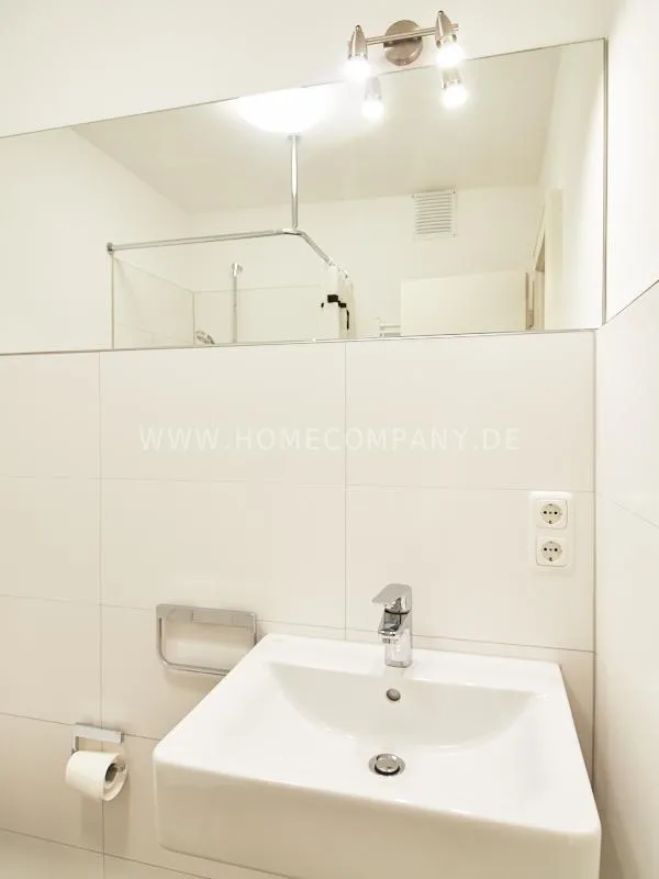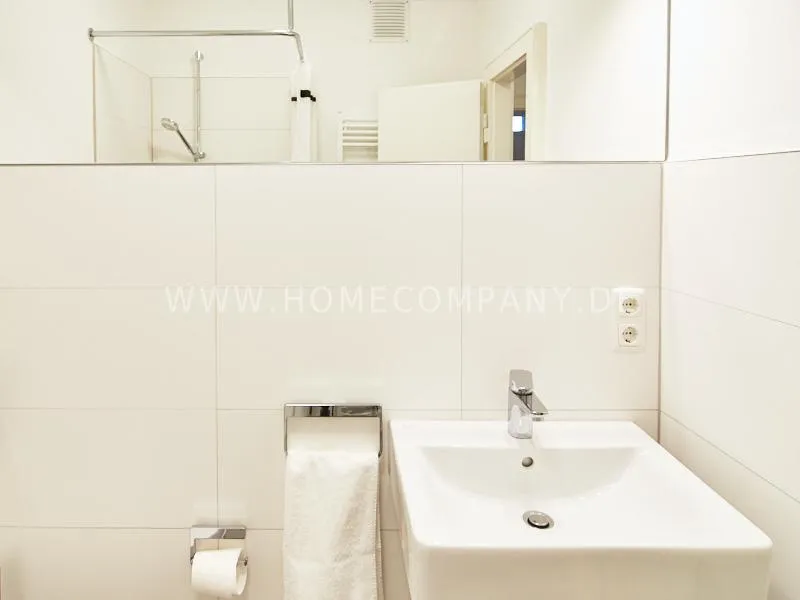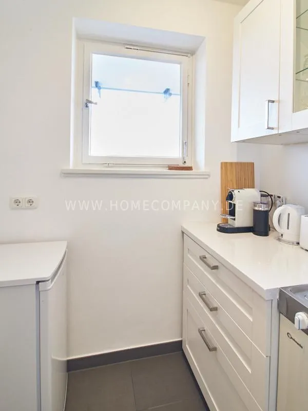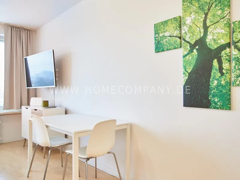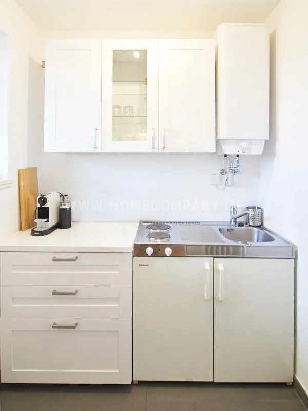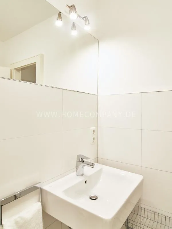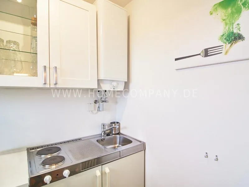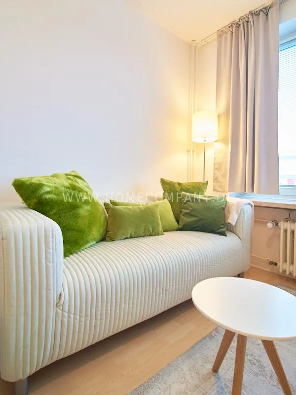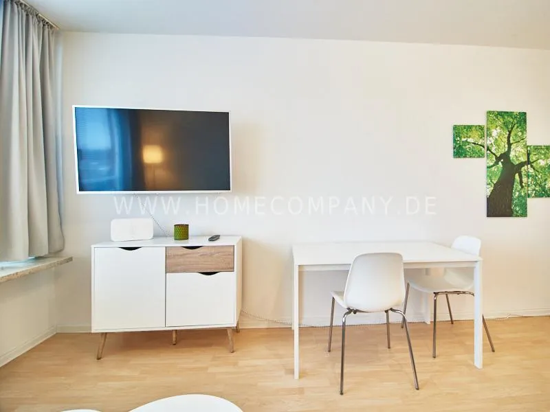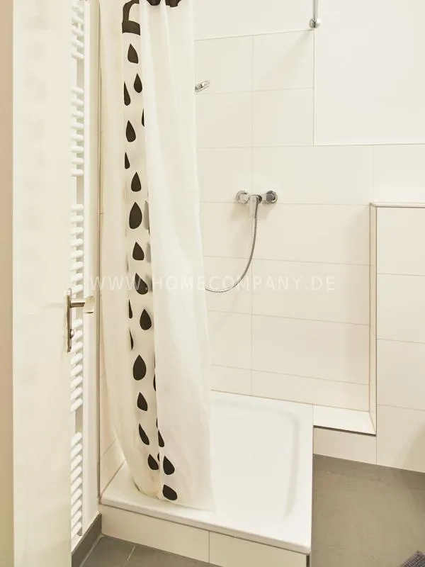 Completely furnished apartment with a nice view over the city. The living / bedroom is divided by a room divider into a living and a sleeping area. The living area facing the window has a small sofa area, TV and a dining table. In the sleeping area is a 1.40 wide bed available. The fitted wardrobes in the hallway provide plenty of room, both for clothing and for all household appliances. The fresh white tiled bathroom with anthracite floor tiles impresses with freshness and clarity. The small kitchen is equipped with a white fitted kitchen. In addition, a small, outgoing hall, the chamber is available as a wardrobe. In the basement of the house is the very well equipped laundry with 3 washing machines, dryer and large slingshot. All devices are coin operated and are operated with € coins.