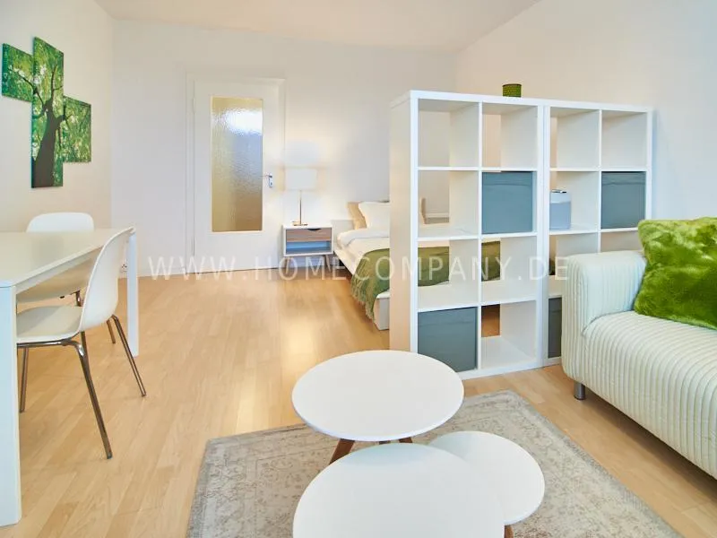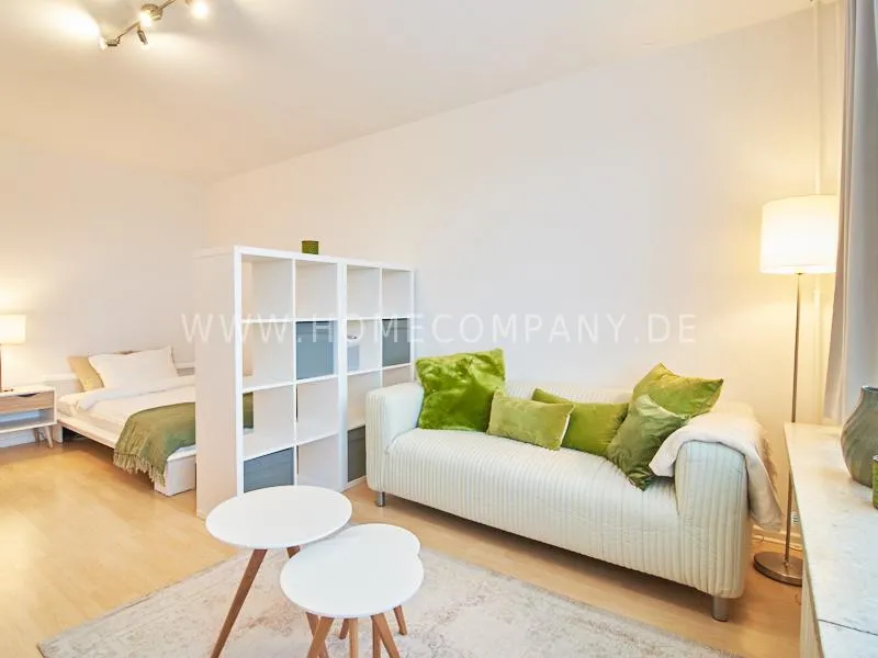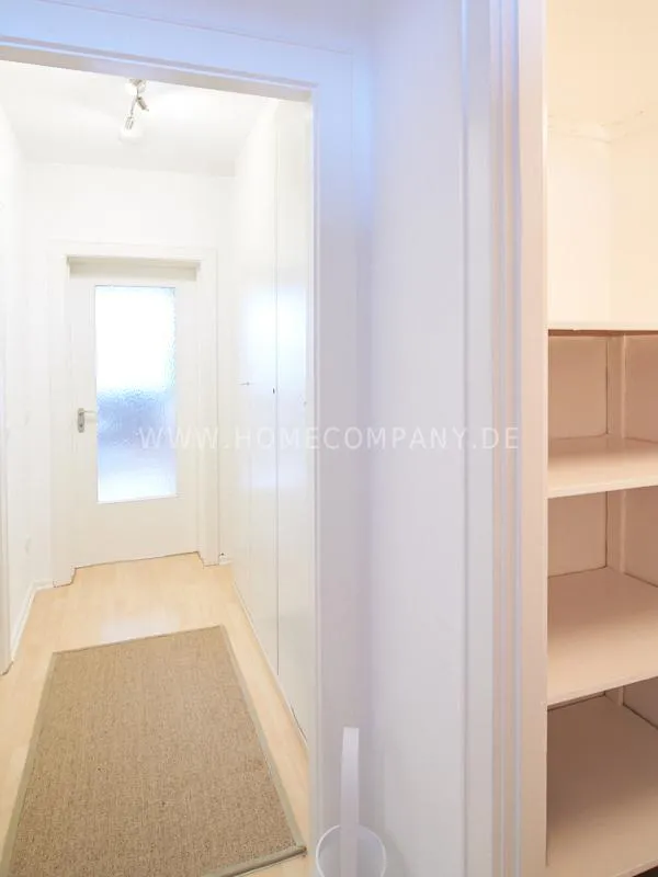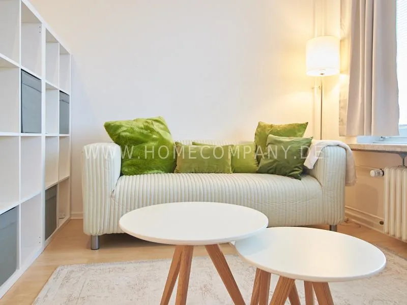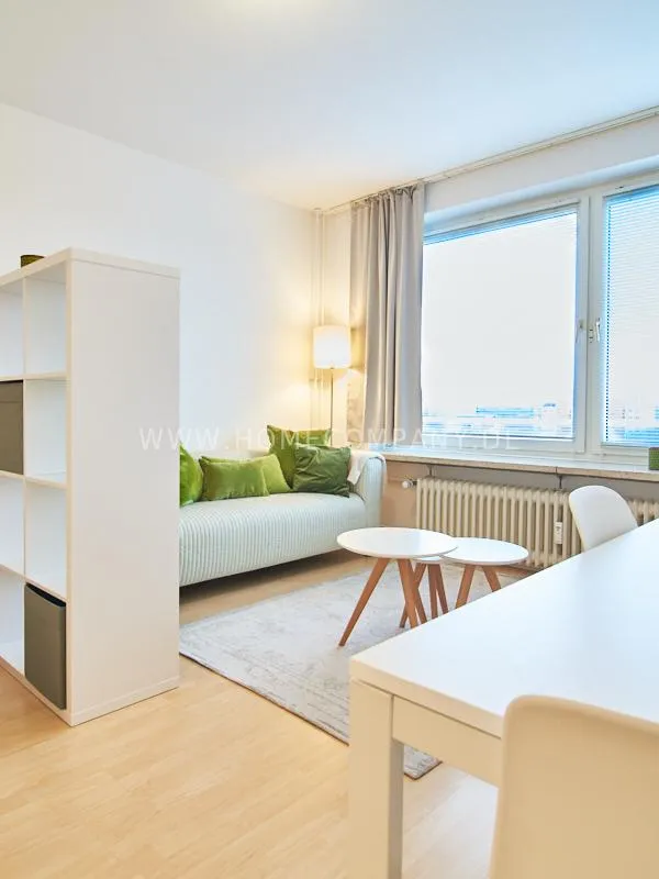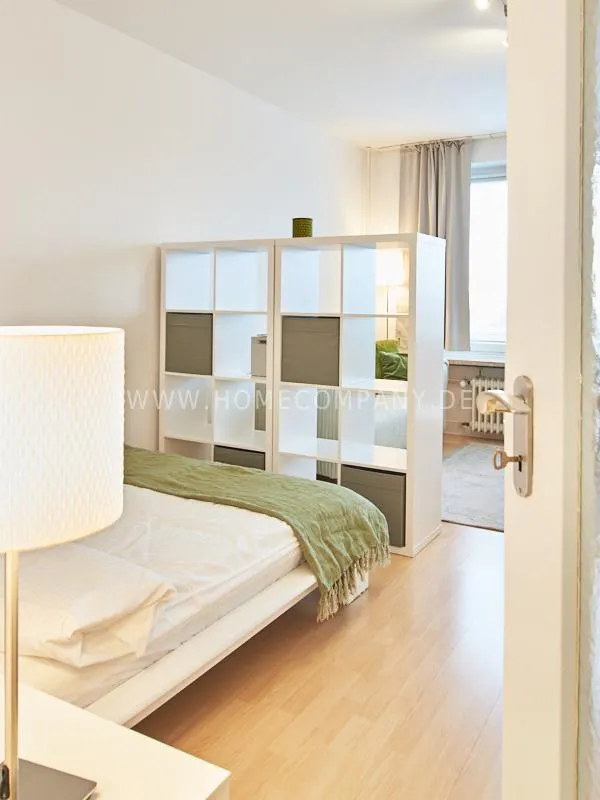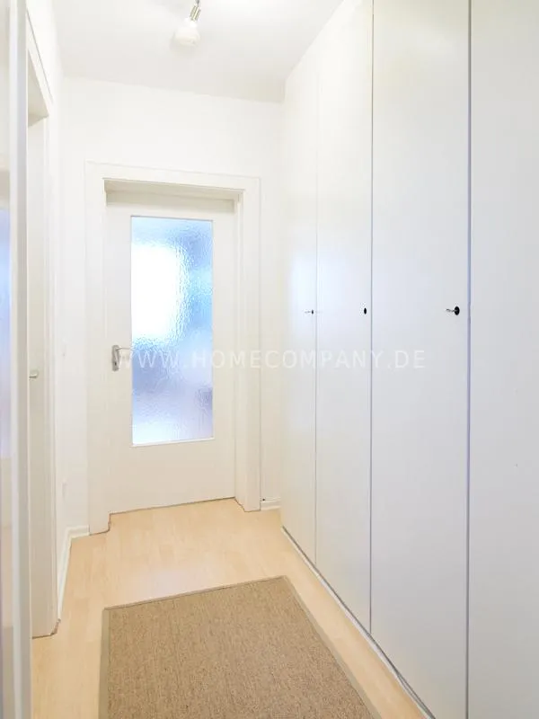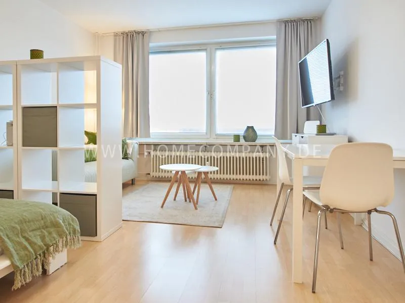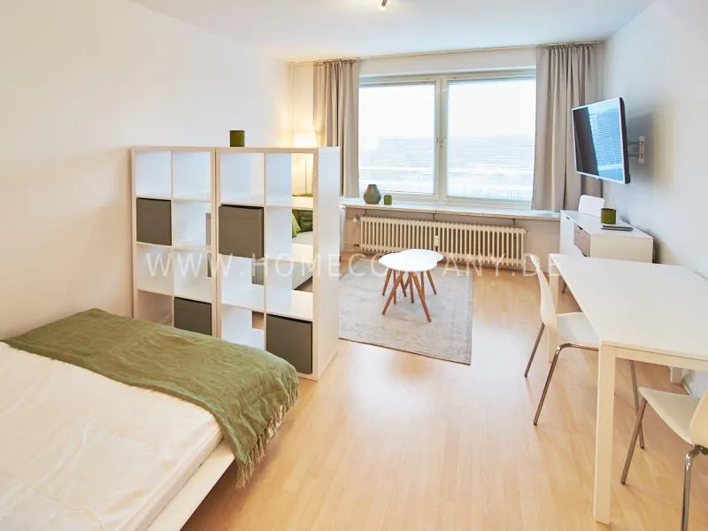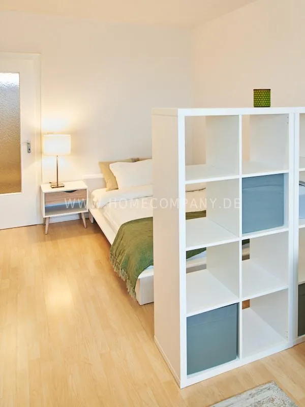 Completely furnished apartment with a nice view over the city. The living / bedroom is divided by a room divider into a living and a sleeping area. The living area facing the window has a small sofa area, TV and a dining table. In the sleeping area is a 1.40 wide bed available. The fitted wardrobes in the hallway provide plenty of room, both for clothing and for all household appliances. The fresh white tiled bathroom with anthracite floor tiles impresses with freshness and clarity. The small kitchen is equipped with a white fitted kitchen. In addition, a small, outgoing hall, the chamber is available as a wardrobe. In the basement of the house is the very well equipped laundry with 3 washing machines, dryer and large slingshot. All devices are coin operated and are operated with € coins.
