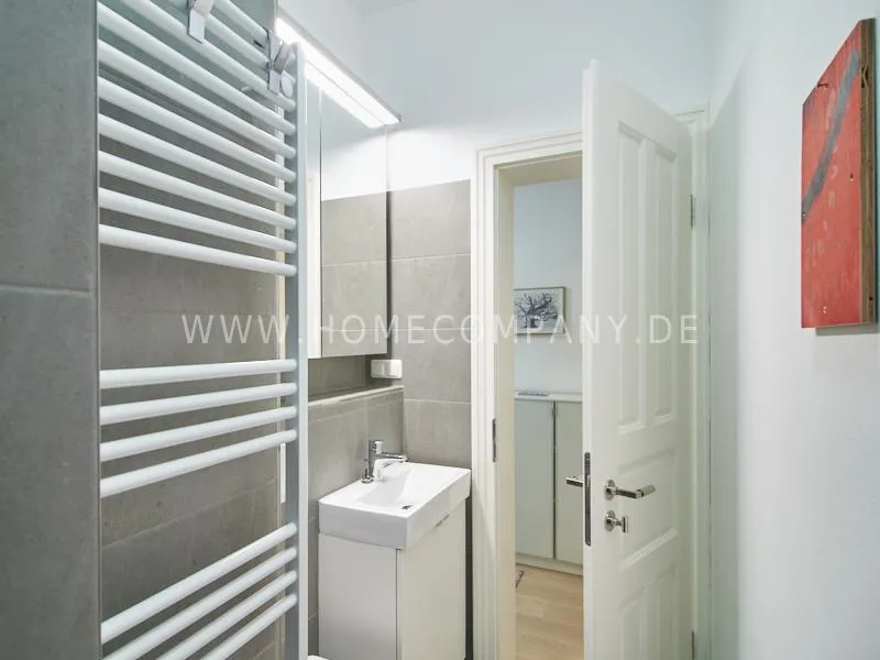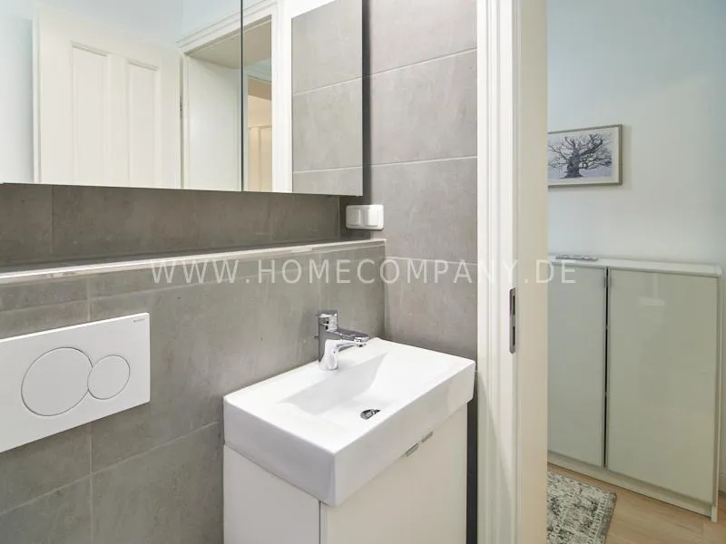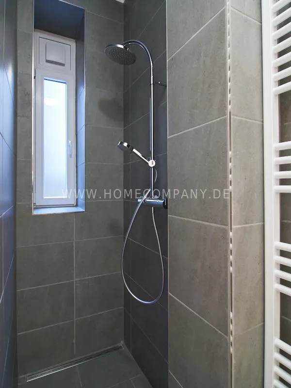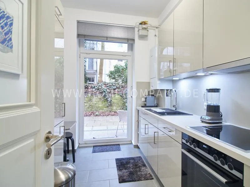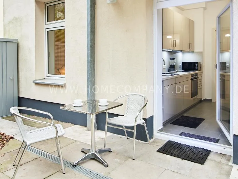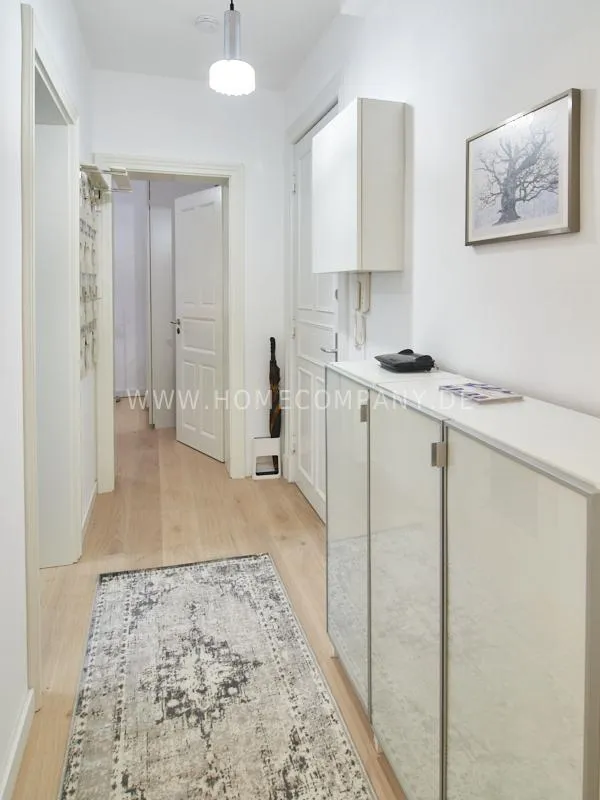Furnished flat in a quiet residential street with typical Hamburg old buildings. The apartment facing the enclosed garden courtyard is very quiet. It is clear and modern in subtle colors. Beautiful oak parquet floors in combination with white coffered doors underline the pleasant ambience of the listed building. Stylish, partly large-scale, modern works of art set accents. The bedroom is furnished with a 1.20 wide bed. Here is a small work area with a table for the notebook. 100 Mbit Internet is set up. The apartment is equipped with a smart TV. The apartment offers plenty of closet space. The modern fitted kitchen is equipped with a dishwasher and washer dryer. The shower room has a modern design with anthracite-colored tiles and a floor-level shower. A special highlight is the large terrace. Garden furniture is available here in a storage box. A small area is protected from rain by the balcony above.