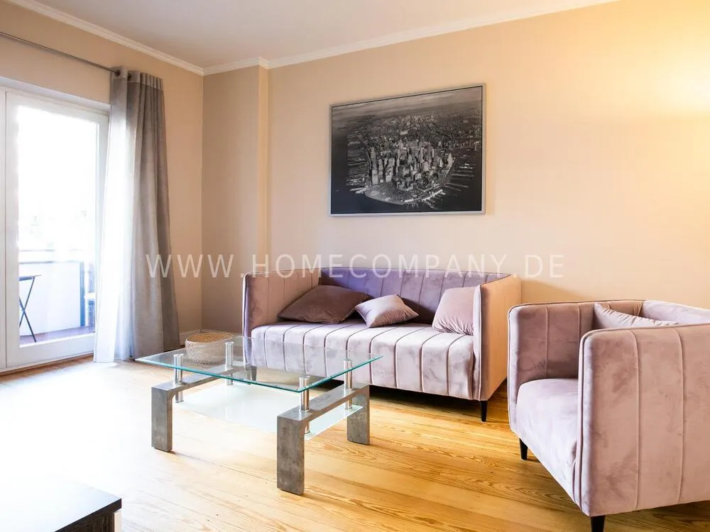 Pleasantly furnished apartment in a beautiful and quiet residential area. The open floor plan creates a sense of spaciousness and openness. The kitchen and dining area are open towards the hallway. A comfortable natural-wood dining table for up to four people is available here. Both the living room and the bedroom are equipped with Smart TVs. The bedroom features a 1.80 m double bed. From the living room, you can access the balcony, where a table with two chairs invites you to relax after work.