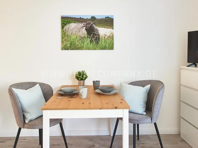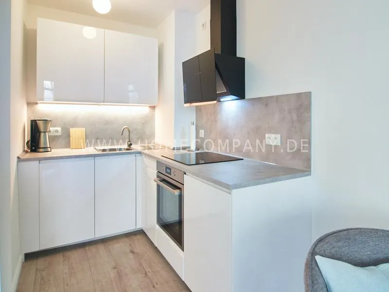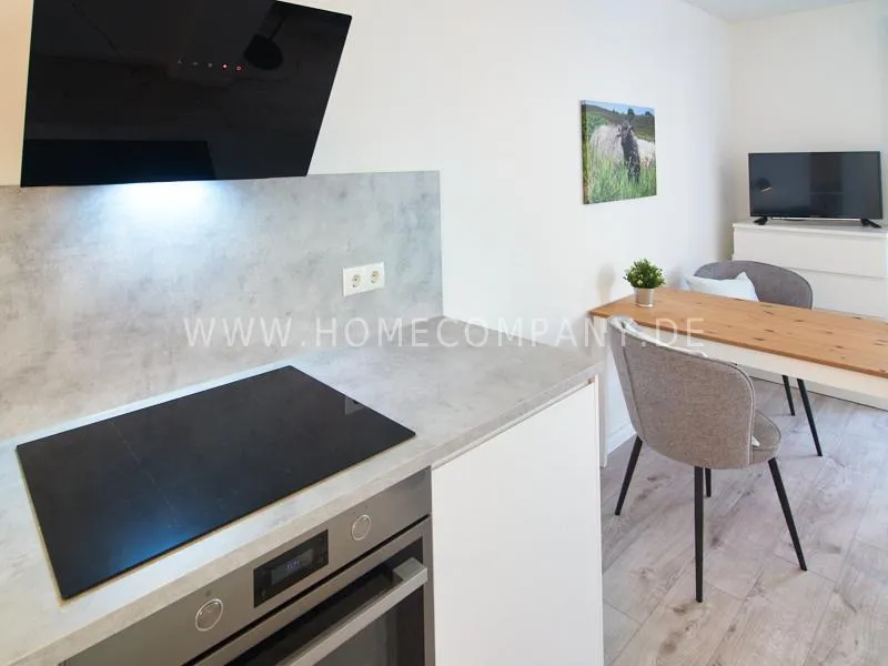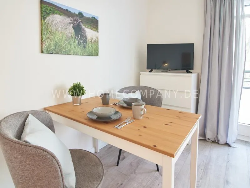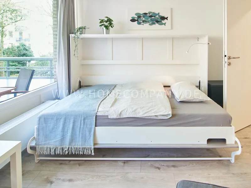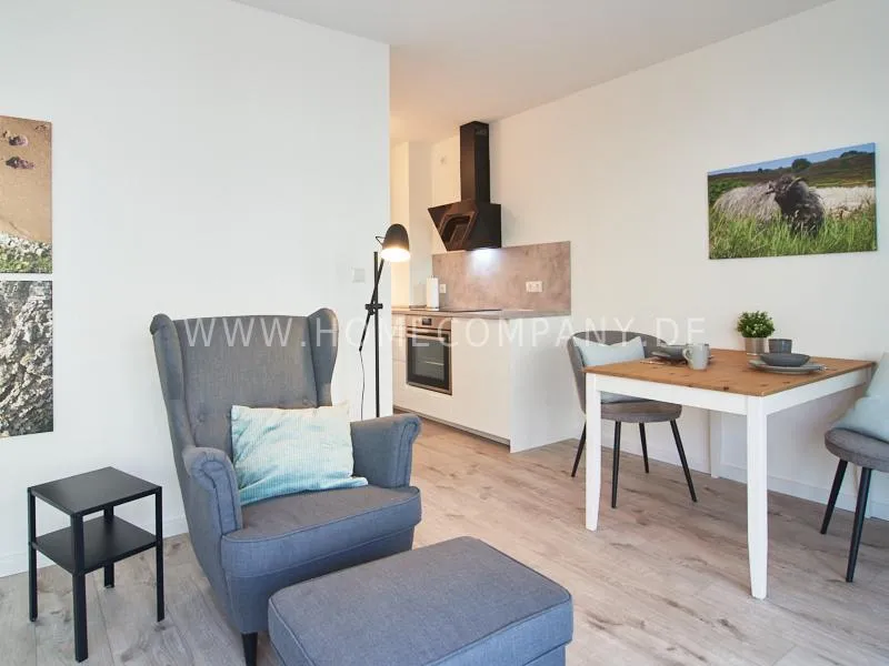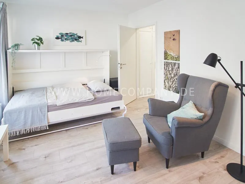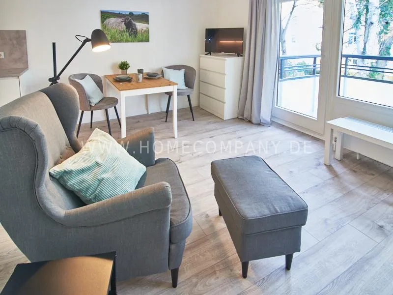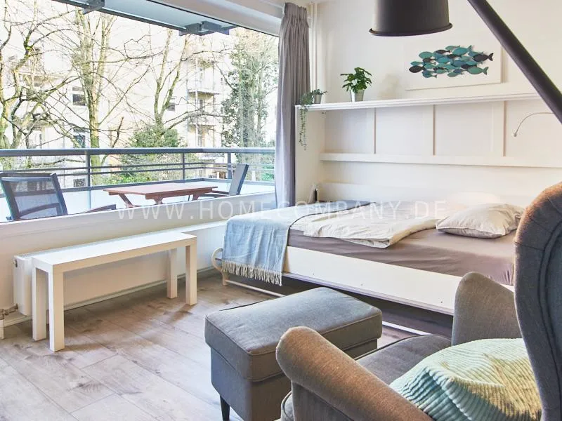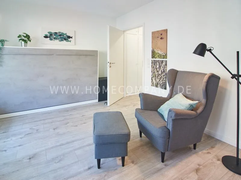Newly furnished and modernized apartment in 2022 in a quiet residential street in Winterhude. The apartment is equipped with a comfortable fold-away bed (1.20 mx 2.00 m), a comfortable wing chair with a stool, a dining/working area with two chairs. The bright fitted kitchen is open to the living area, so that the apartment offers a spacious feeling. There is a built-in closet in the hallway. The bathroom is modern in gray tiles. An easy-care vinyl design floor with a plank look has been laid in the apartment. A special highlight is the large balcony, which is furnished with a table and 2 chairs and invites you to linger after work.