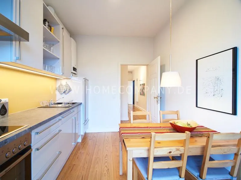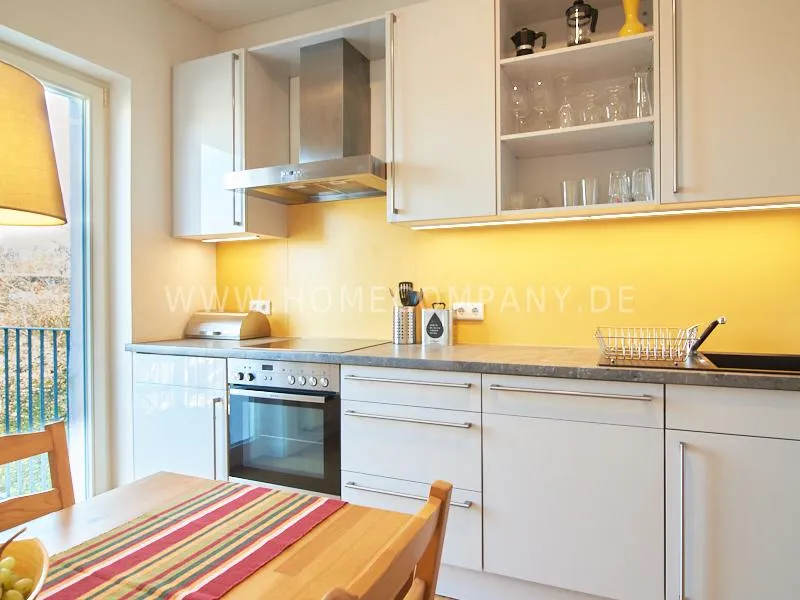 Nice flat in an old building close to the Schanzenviertel. The bedroom is equipped with a 1.60 m wide double bed. The wardrobe has adequate storage space. In addition, there is a small desk for the notebook. The living room is furnished with a convirtable sofa, coffee table and TV. In the kitchen is a dining table available. The well-equipped kitchen is fitted with white fronts and a mango-colored panel on the wall. The apartment is decorated in bright shades of gray with white furniture and few parts of yellow decoration.