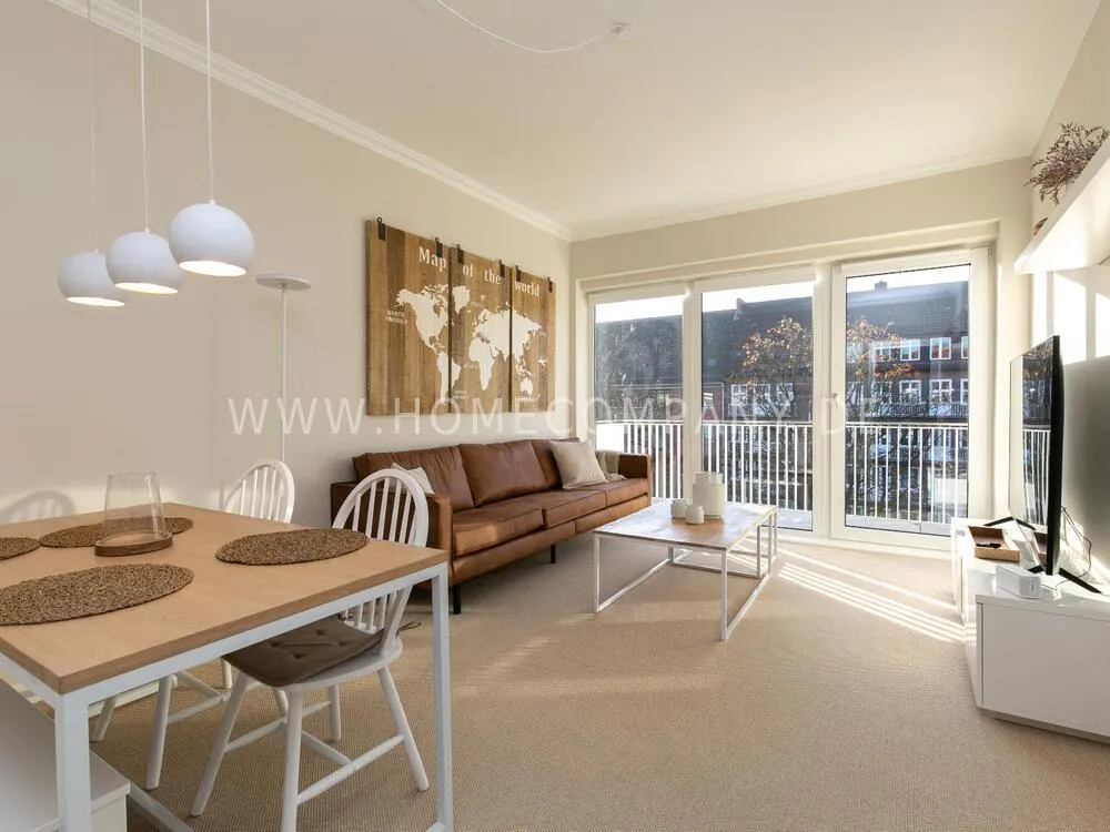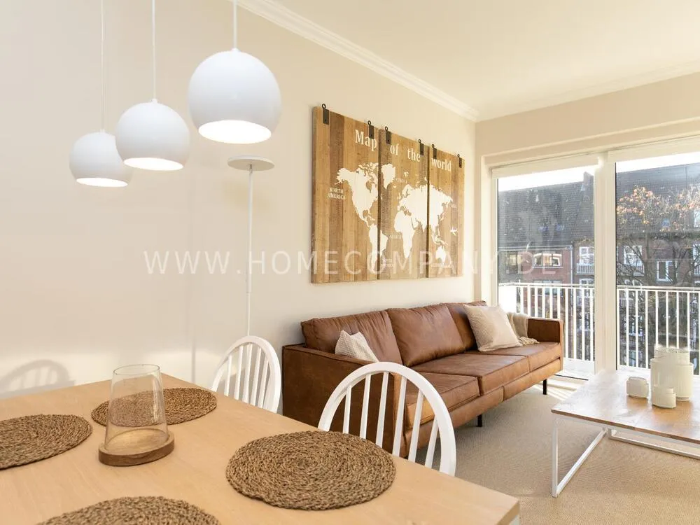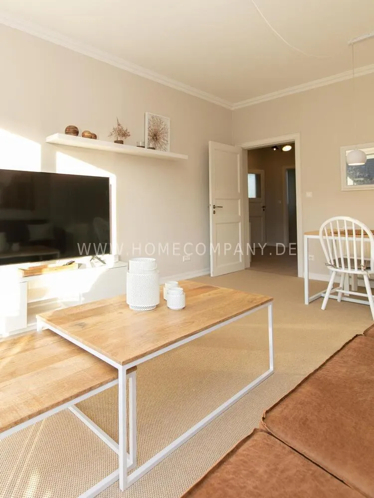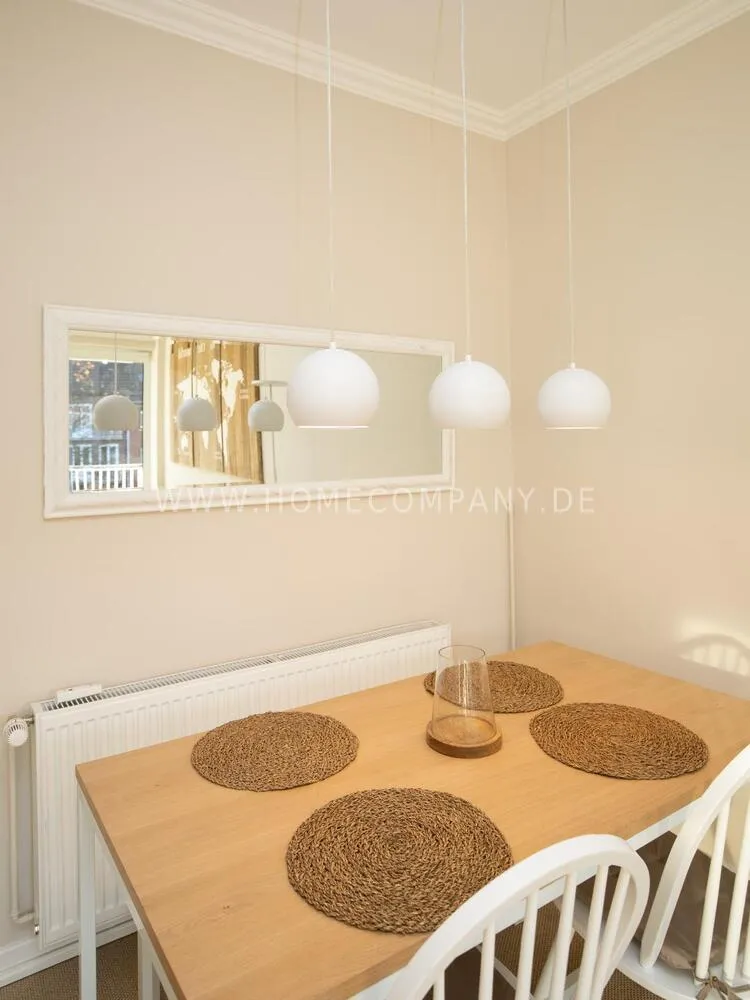 The apartment, located in a prime location in Harvestehude, is kept in subtle light natural tones in Scandinavian style. There is a brown suede sofa and comfortably dimensioned smart TV as well as a dining table in the living room. A bench and two chairs can accommodate up to four people. The bedroom is furnished with a 1.60 m wide bed. There is also a desk in the spacious hall area and a washer-dryer in the apartment. A special highlight are the two balconies, one of them is south-facing. The other balcony is lit by the morning sun and faces the street.