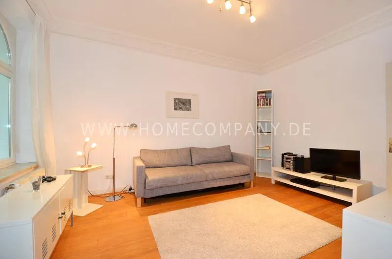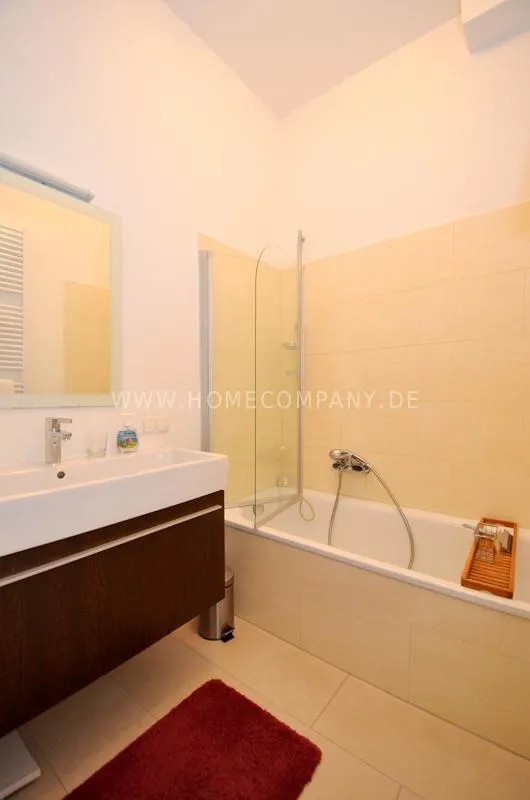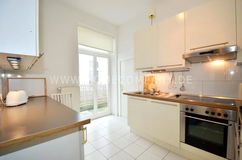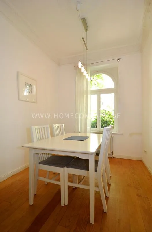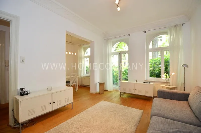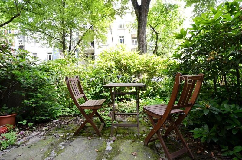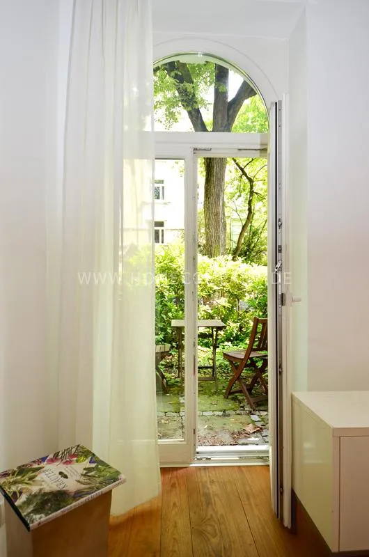 Modern furnished flat in a beautiful Art Nouveau building. The flat has a cozy living room that leads into a dining room. The bedroom has a double bed and plenty of closet space. A door leads from the kitchen into the garden, which faces south and has a small sitting area.
