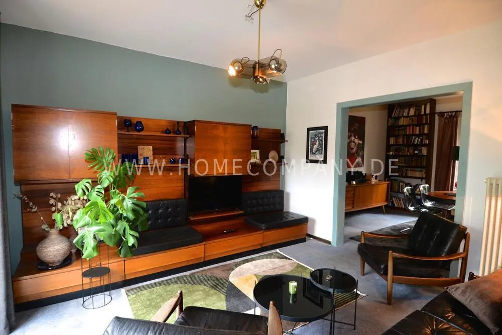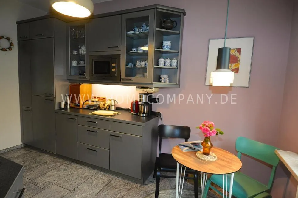 The interior decor combines stylish vintage and mid-century furniture with modern colors and details, creating a harmonious and inviting atmosphere. The fully equipped kitchen leaves nothing to be desired, offering everything you need for cooking and dining.