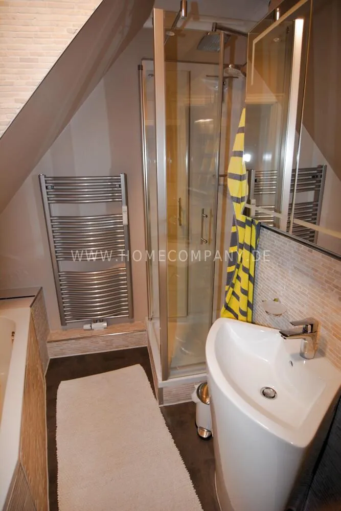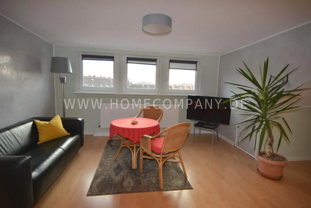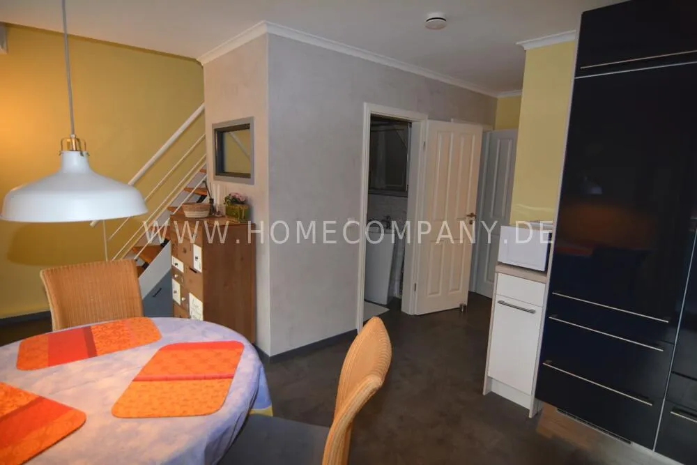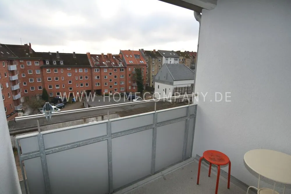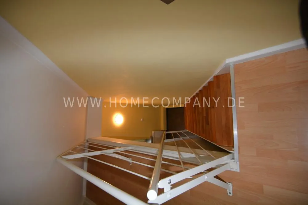 The renovated 1 bedroom loft apartment is situated on the 4th and 5th floor. Highly central location in the district of Kiel-Ravensberg, near the CAU university and the city center. Features include new furniture, a lovely balcony, a washing machine and a dryer, cable connection, internet and central heating. Bright and clean open plan fitted kitchen with dishwasher and dining area. The modern bathroom is equipped with a tub and a shower, the toilet is separate. The living room has a sofa bed. The actual bedroom is on the floor above and comes with a sitting area with TV and a large walk-in closet. Dishes and pots are available.