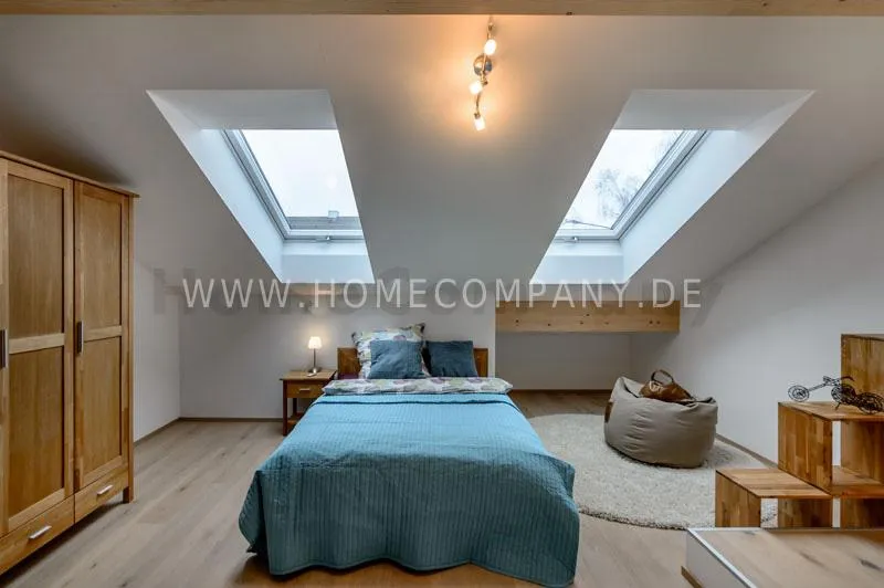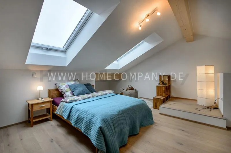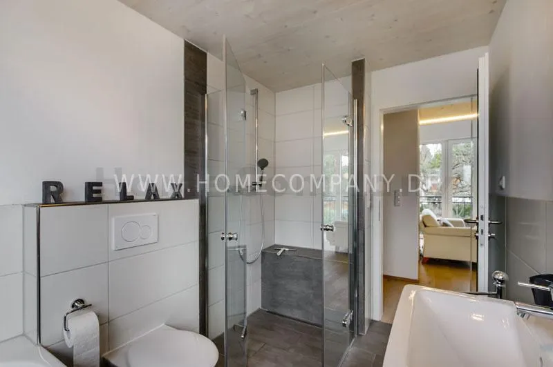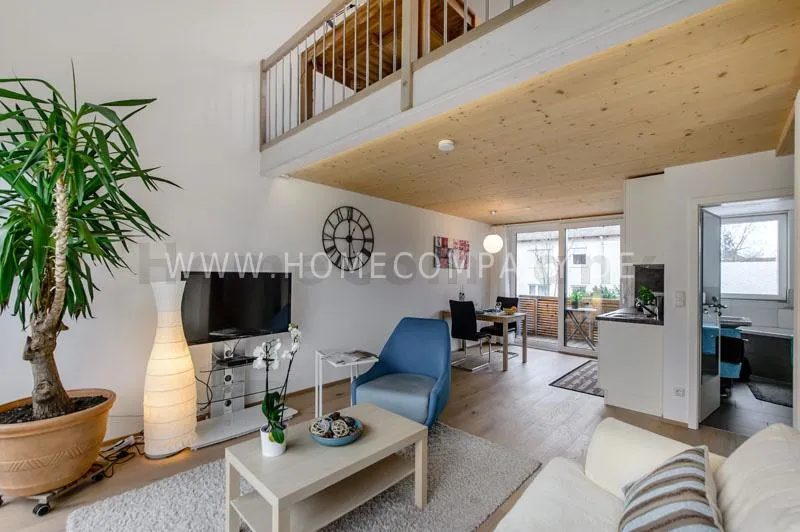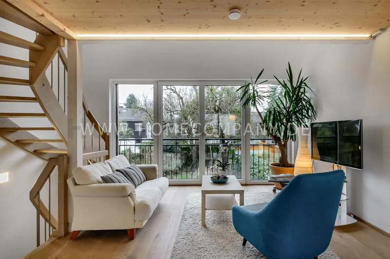 Great furnished 1.5-room apartment with balcony in Pasing. Own entrance in modern wooden building in a very quiet side street. Open living concept over 3 levels with plenty of daylight. In the entrance area there is a small laundry room with washing machine. A staircase leads to the upper floor. Here is the living/dining area with balcony (furnished with table and 2 chairs), modern TV combination with Telekom Entertain, comfortable couch and armchair with view into the green. The floor-level windows can be opened completely and offer a nice view over the beautiful overgrown garden. The new fitted kitchen has everything you need daily, it also comes with dishwasher and microwave. A further staircase leads to the gallery. Here is the sleeping and working area with double bed, wardrobe and desk. The daylight bathroom is new and has a bathtub as well as a glass shower. All windows have electric blinds. The beautiful oak parquet floor has a floor heating.