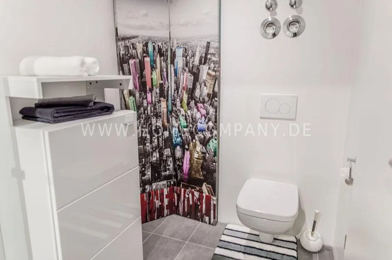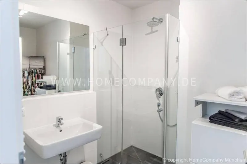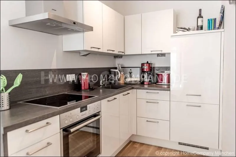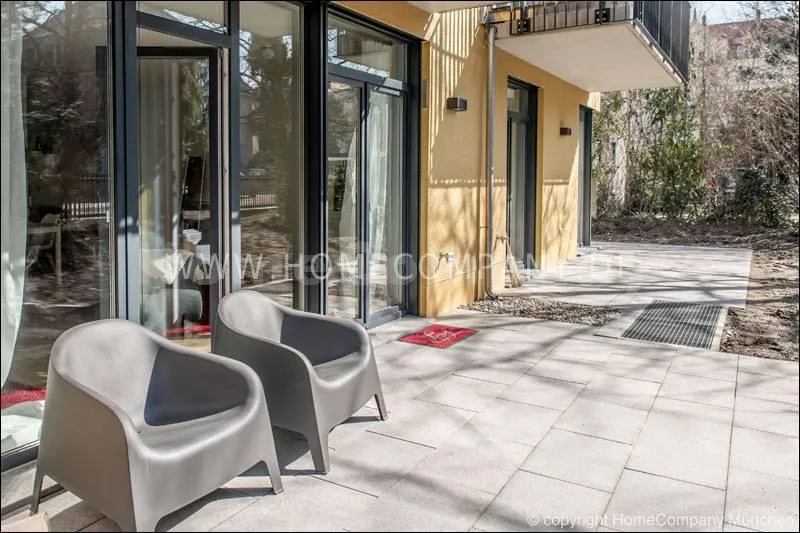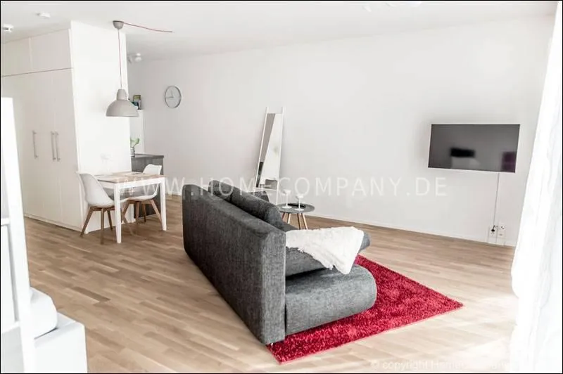 Great furnished 1-room apartment in Schwabing. New building, ground floor with terrace and small garden. Spacious living room/bedroom with floor to ceiling glass windows, furnished with a comfortable gray sofa bed, flat-screen TV and a desk corner. Visually separated sleeping area with double bed. Modern clear style. Open and very well equipped kitchen with everything you need daily, including dishwasher, ceramic hob, oven, etc. There is also a small dining area adjacent to the kitchen. A large practical built-in wardrobe in the entrance area provides ample storage space. Flooring: nice noble oak parquet floor and gray tiles. Modern bathroom with large glass shower and plenty of storage space. Own washing machine available in the laundry room of the house. An underground parking (below) is also available.