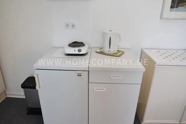 Cooking plate, fridge, kettle, kitchen cupboard.