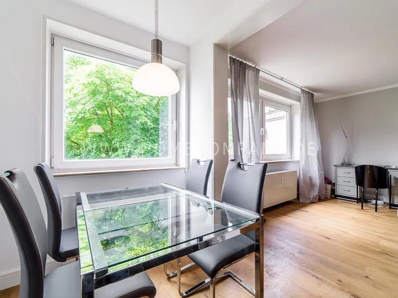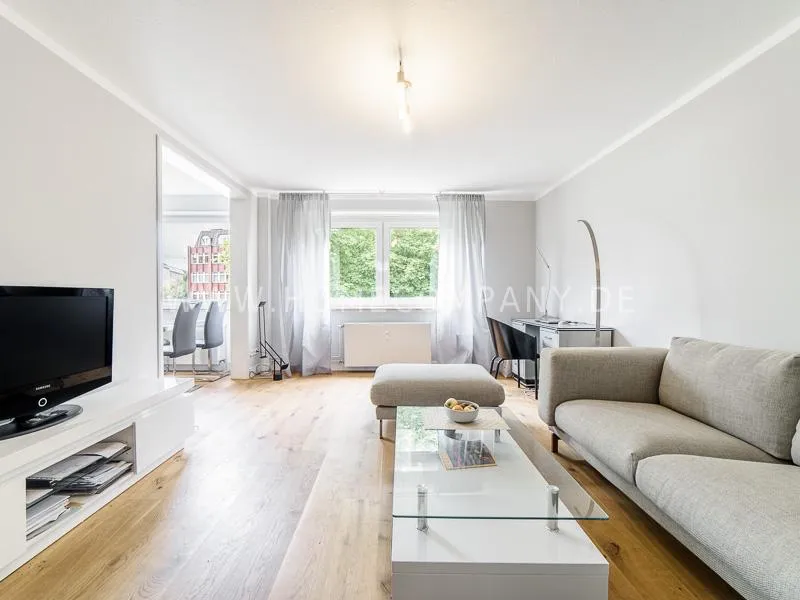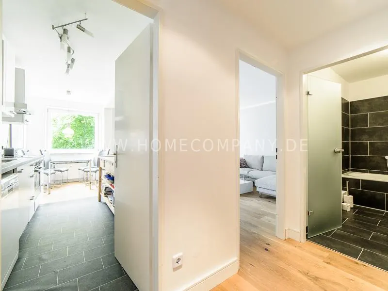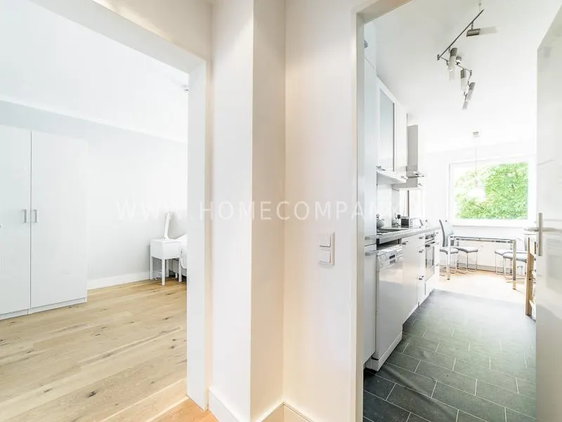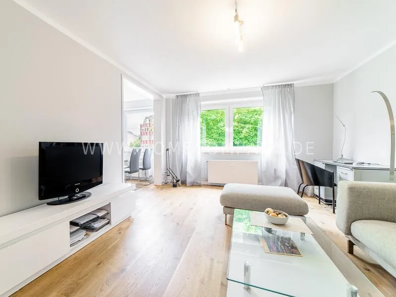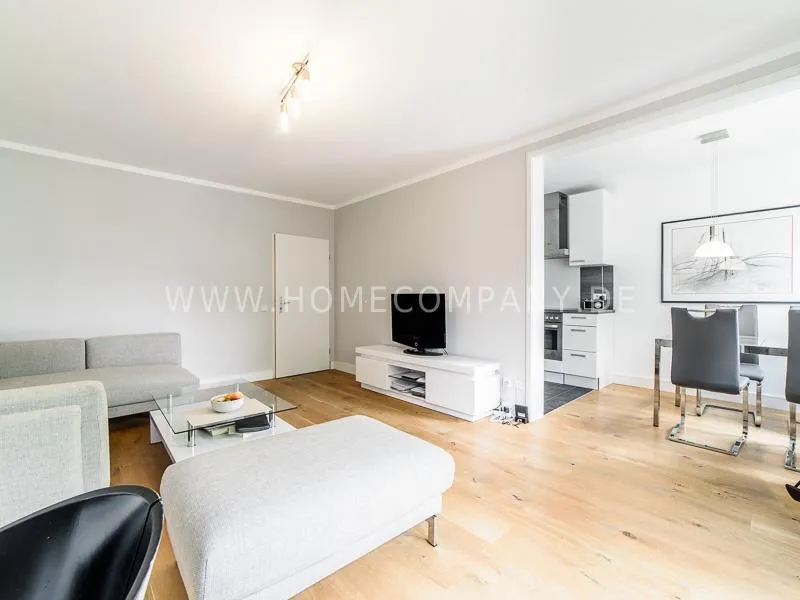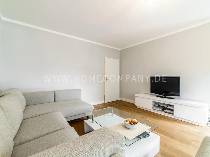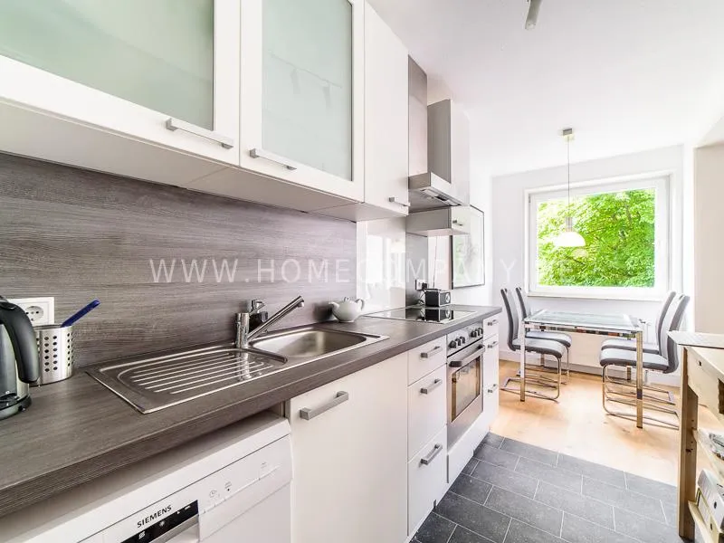 Modern furnished and well-kept apartment in a quiet location in the backyard. The apartment was renovated in 2010 and 2016 completely refurbished. The apartment has a balcony facing the sunny South. The modern kitchen is equipped with all appliances including dishwasher. The spacious living room is equipped with a coach - no sofa bed - but a sleeping possibility for guests. A TV and Wi-Fi (50 MBit) are available. Furthermore there is 1,80 m box spring bed available. The floor has wooden parquet. A separate small washing machine is in the apartment available, as is a large laundry room.