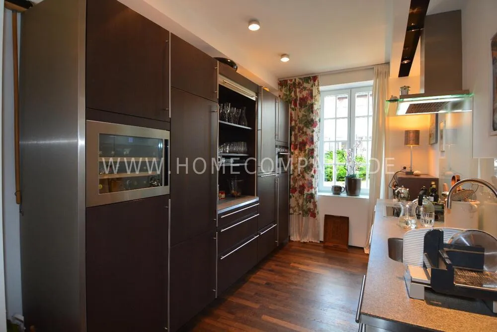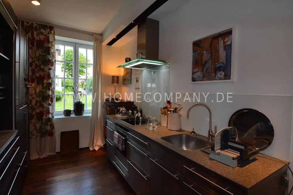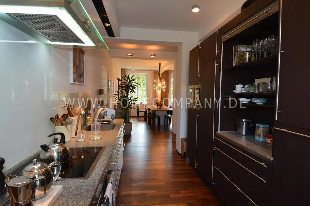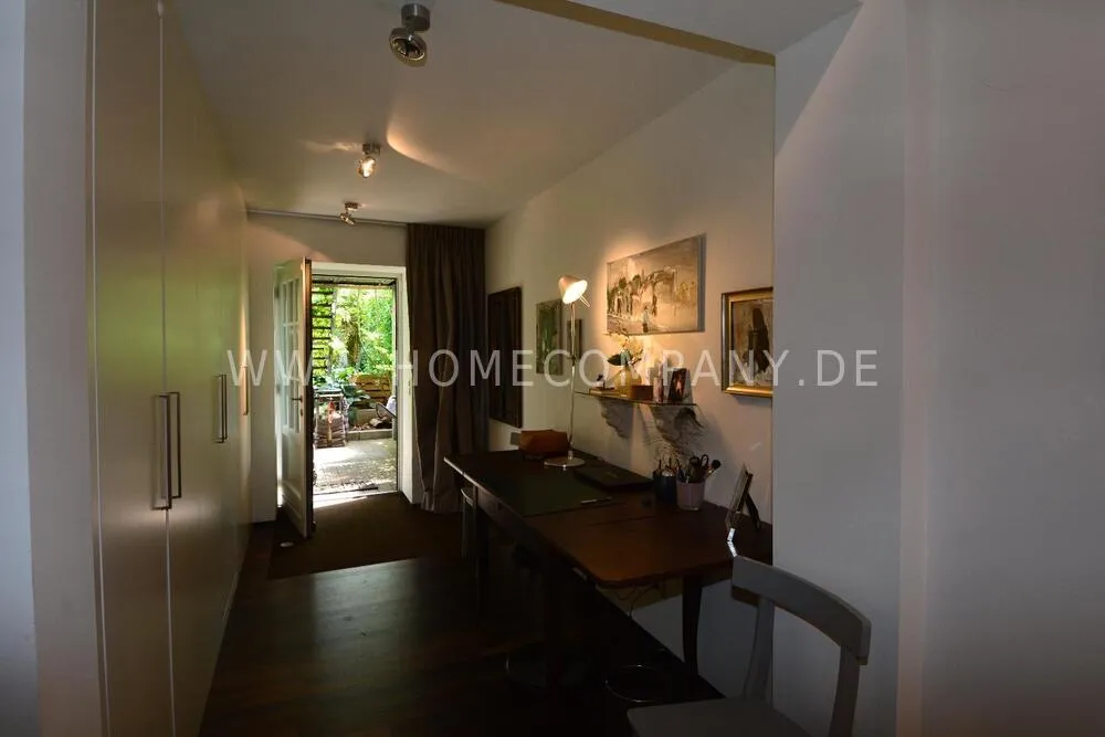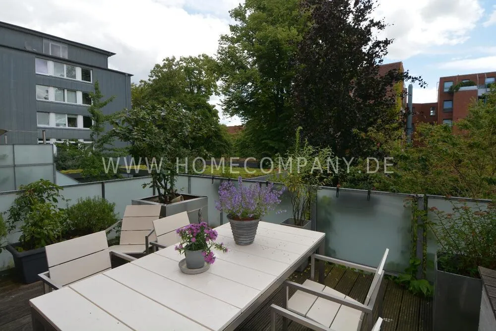 Very nice duplex apartment in a central city location in Kiel. The house was recently extensively renovated. The apartment has an open living area on the upper floor with a large dining table and a high-quality open fitted kitchen with all appliances including a wine cabinet. On this floor is the guest toilet and a large terrace. On the lower floor is the large bedroom and the shower room with a floor-level shower, and a very large walk-in closet. Here you will also find the study with a large built-in closet. From below you can reach the lower terrace and the garden and a path directly to the parking space. The apartment has underfloor heating. Despite its central location, Siei is very quiet.