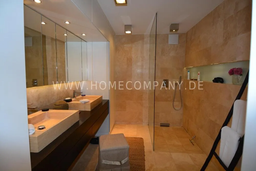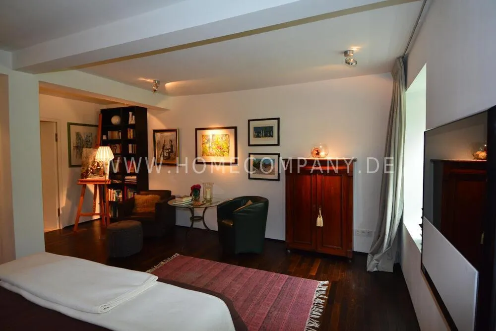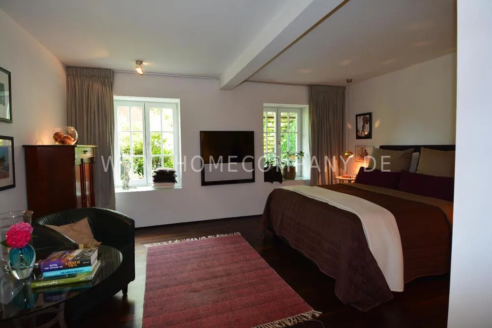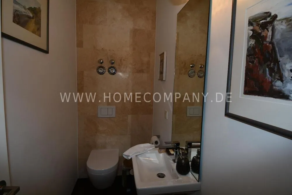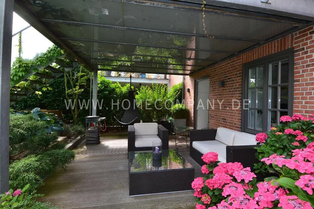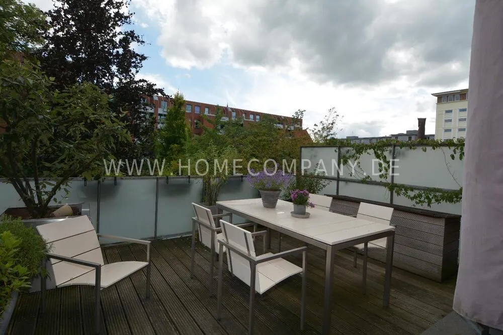 Very nice duplex apartment in a central city location in Kiel. The house was recently extensively renovated. The apartment has an open living area on the upper floor with a large dining table and a high-quality open fitted kitchen with all appliances including a wine cabinet. On this floor is the guest toilet and a large terrace. On the lower floor is the large bedroom and the shower room with a floor-level shower, and a very large walk-in closet. Here you will also find the study with a large built-in closet. From below you can reach the lower terrace and the garden and a path directly to the parking space. The apartment has underfloor heating. Despite its central location, Siei is very quiet.