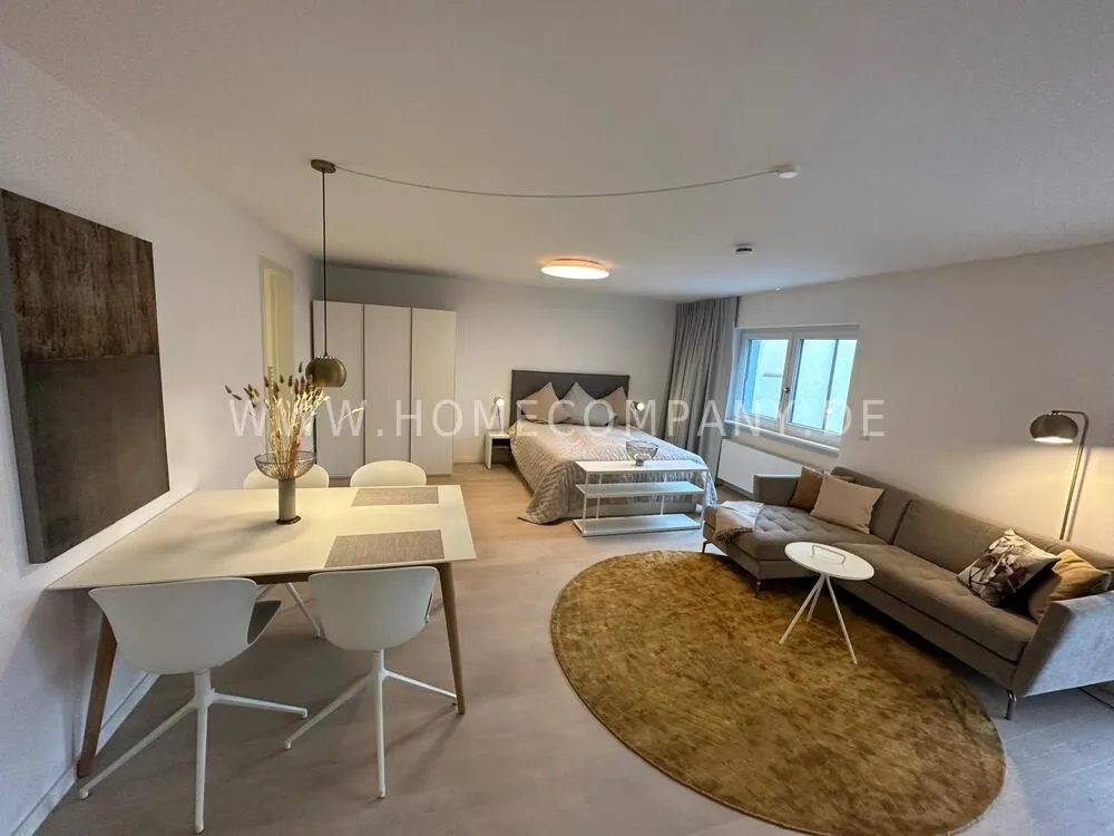 The spacious living and sleeping area offers a double bed, dining area for 4 people and a high-quality sofa.