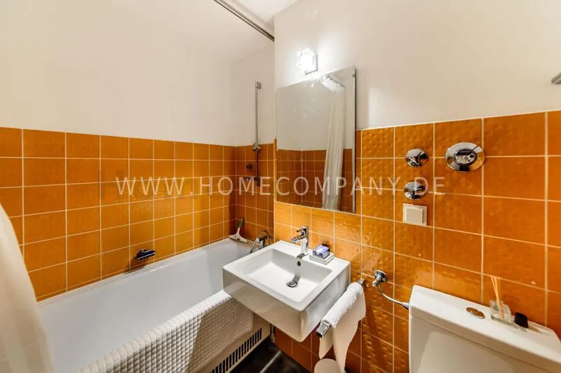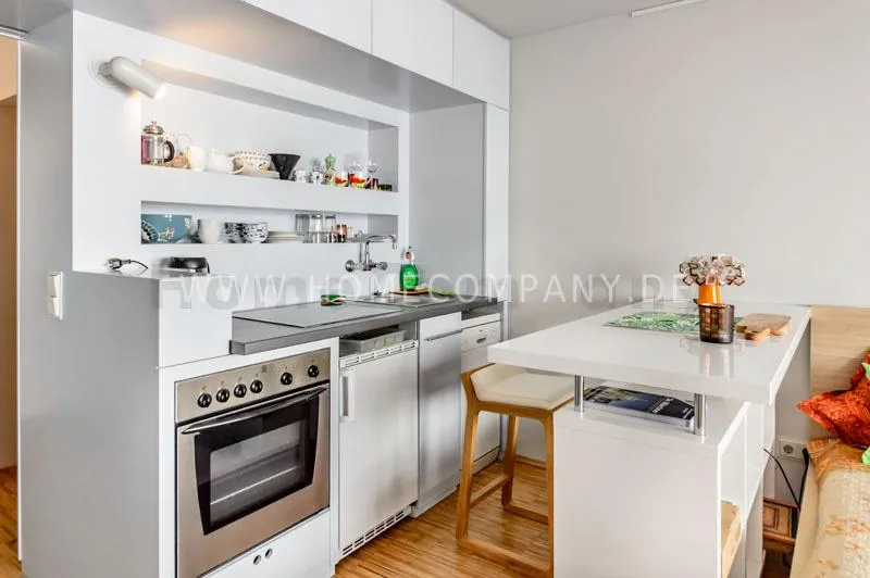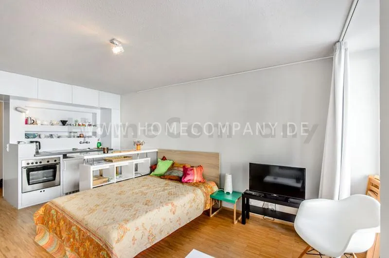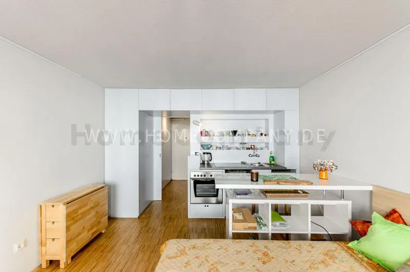 Nicely furnished 1-room apartment near Rotkreuzplatz, fully equipped. 1st floor with elevator. Combined living room/bedroom with French bed (width 1.40m) and comfortable armchair. Folding dining table with 2 chairs. Tiled bathroom with bathtub. Modern kitchen with ceramic hob and oven. Due to the many built-in cupboards a lot of space is available. In the apartment beautiful laminate floor is laid. Washing machine in the laundry room in the basement for communal use; there is also a laundry room nearby. Shops within walking distance. Public transport close by.