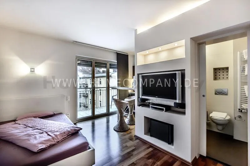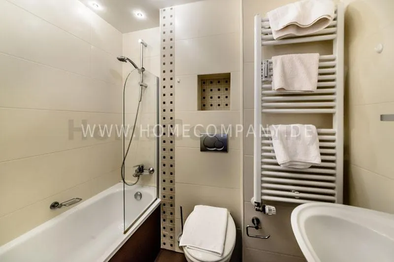 Elegant third-floor apartment with lift and balcony in quiet area of Munich. Parquet flooring, modern living and sleeping area with eating-corner and home-office area. Double bed, small, open fitted -kitchen of high quality, with dishwasher and microwave. BOSE 3-2-1 Dolby surround HiFi System, flatscreen-TV for your convenience. Coin-operated washing machine in the laundry room of the house. Telephone and internet available on request. Internet-surcharge: 25,00 EUR + VAT.