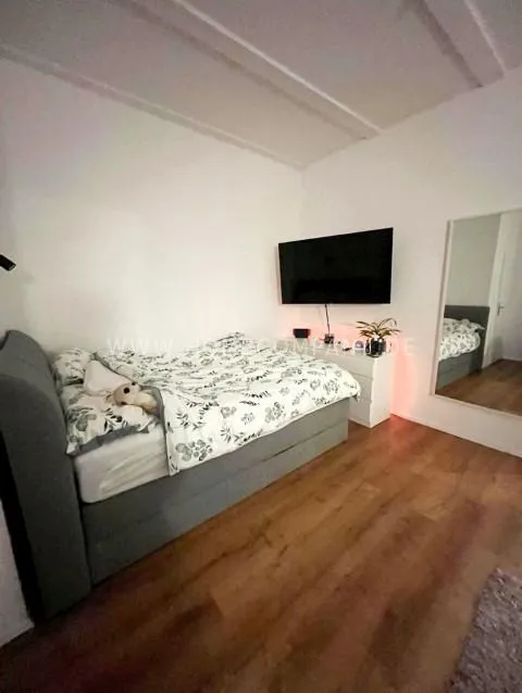 Living room and bedroom with bed 140x200 cm, sofa and table with 2 chairs, satellite TV flat screen and wall unit, wardrobe.