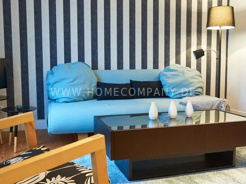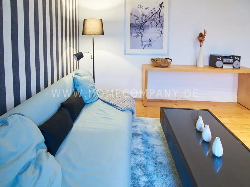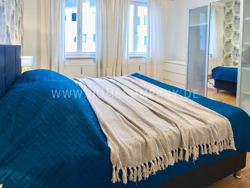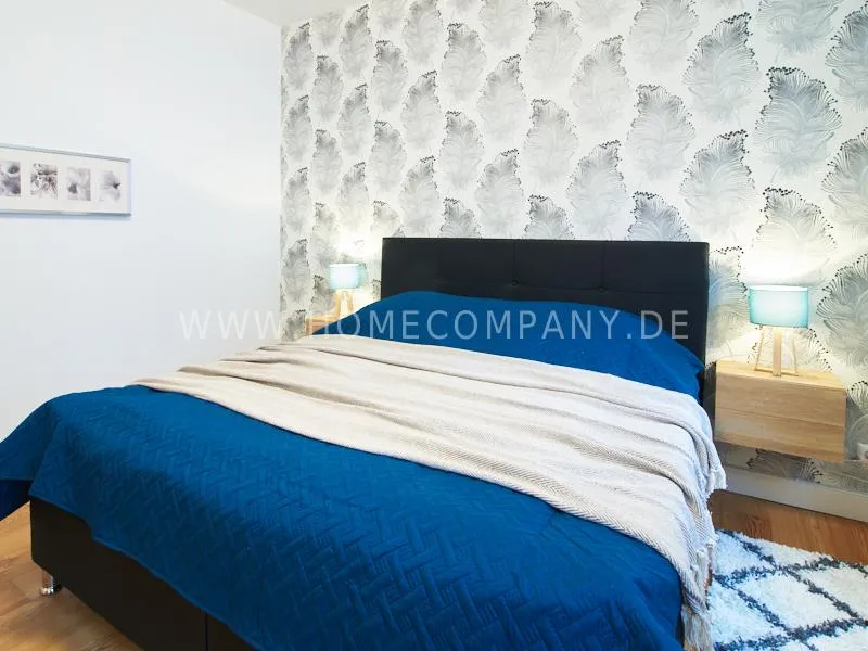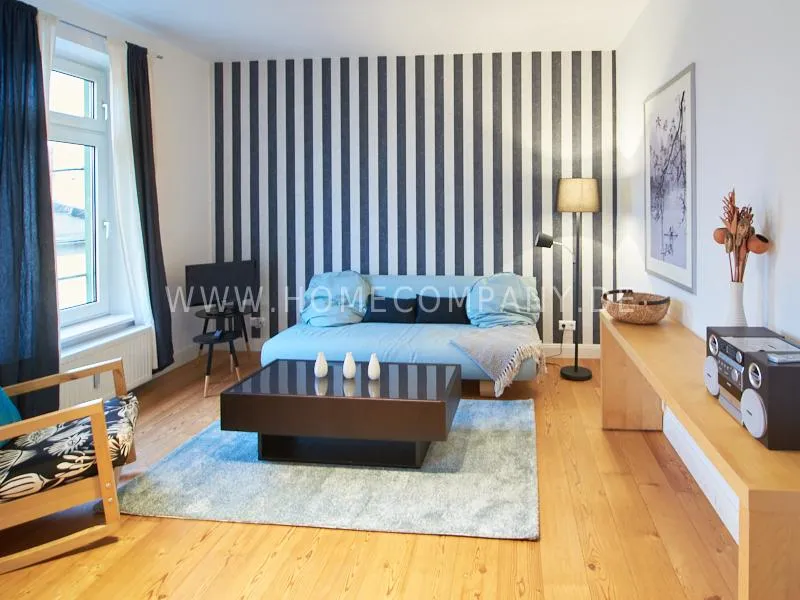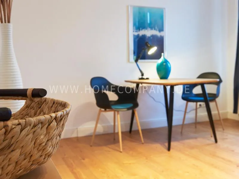Newly and modernly furnished flat in quiet and very central location between exhibition centre and university. The flar offers a subtle and classy interior and is equipped with underfloor heating. The dine-in kitchen with bistro table is open to the hall. The bedroom is oriented to the backyard and therefore very quiet, it is furnished with a double Boxspringbed and a spacious wardrobe. The living room is equipped with a convertible sofa, armchair with coffee table, a commode and an extending table.