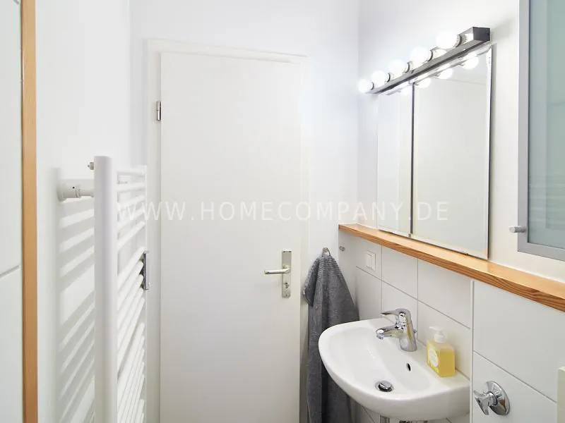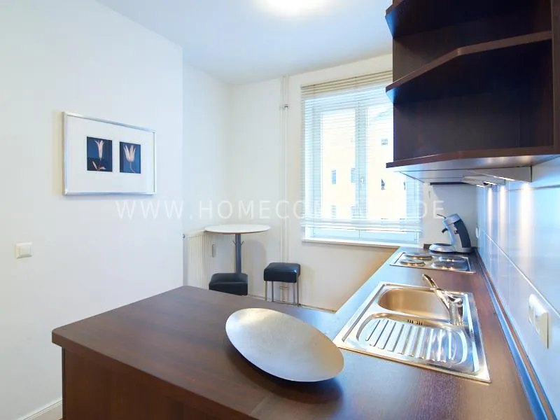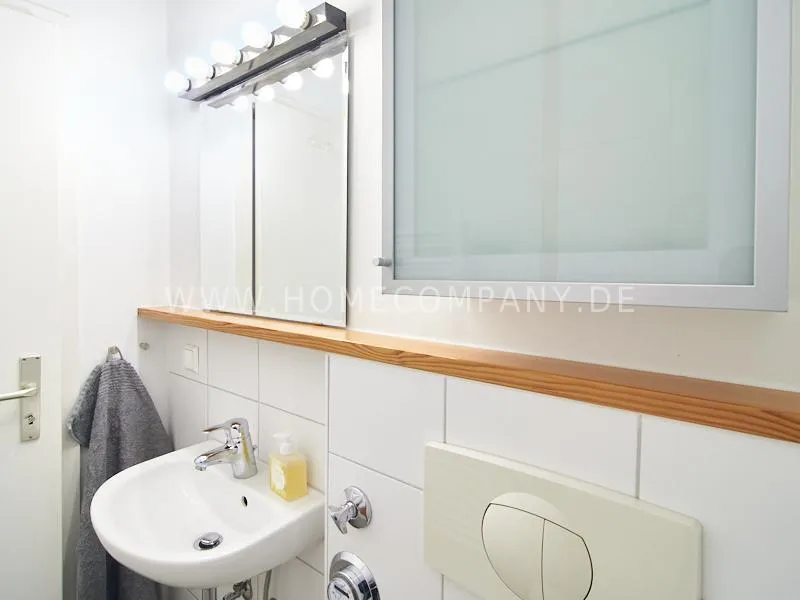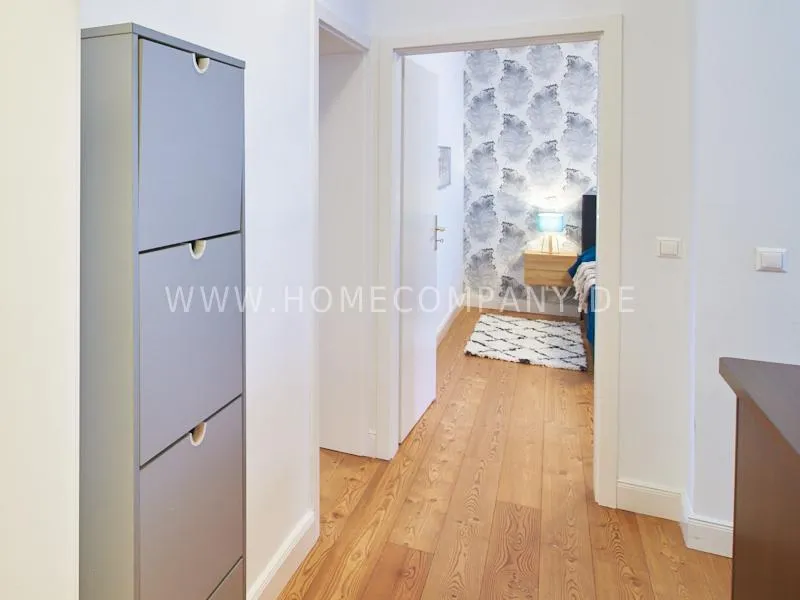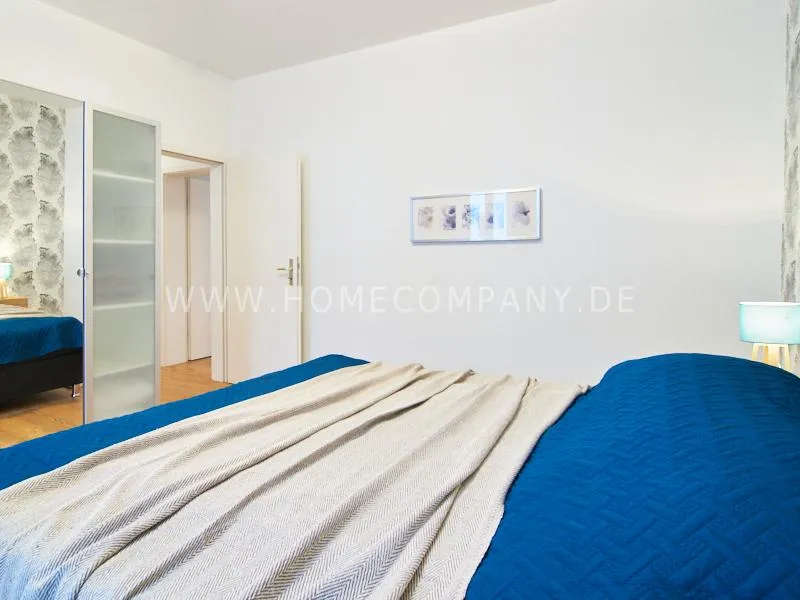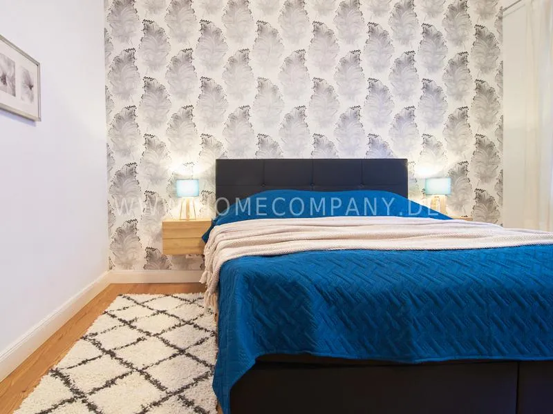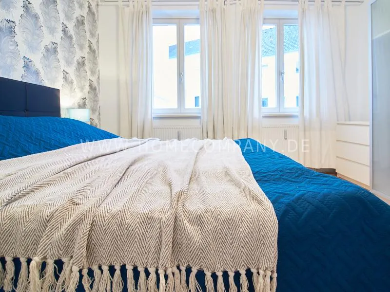 Newly and modernly furnished flat in quiet and very central location between exhibition centre and university. The flar offers a subtle and classy interior and is equipped with underfloor heating. The dine-in kitchen with bistro table is open to the hall. The bedroom is oriented to the backyard and therefore very quiet, it is furnished with a double Boxspringbed and a spacious wardrobe. The living room is equipped with a convertible sofa, armchair with coffee table, a commode and an extending table.