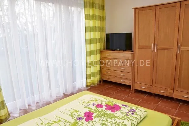 Double bedroom 15 sqm with bed 140 x200 cm, bedside table, chest of drawers, Sat TV, cupboard, table, chair.
