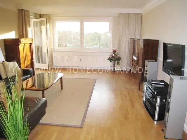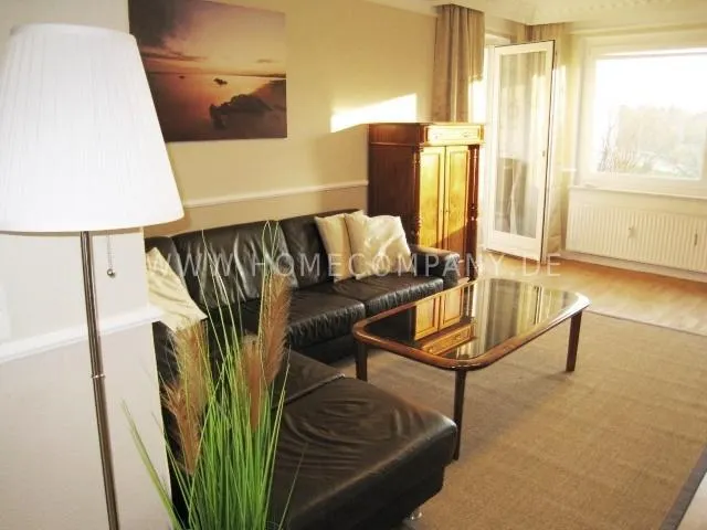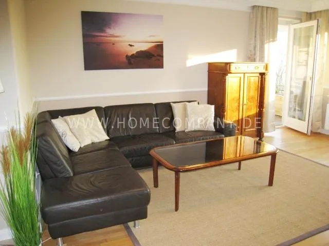 Living room with leather couch, couch table, vertico, HiFi-rack, flat-TV, cupboard, access to