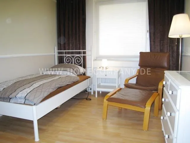 3rd sleeping room with single bed, bedside table, armchair with stool, chest of drawers, wardrobe.