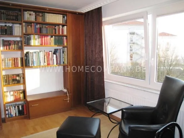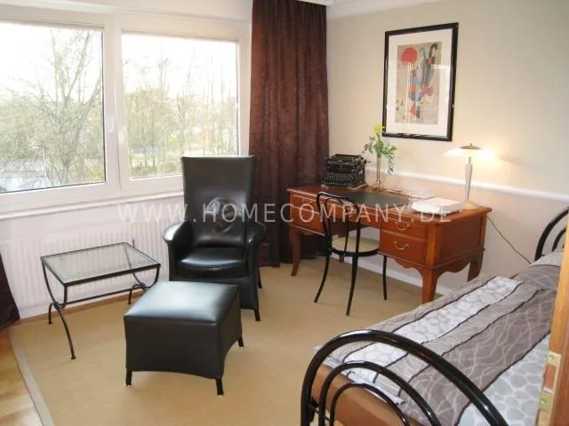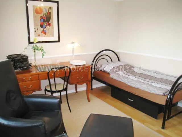 2nd sleeping room with single bed, writing desk, chair, leather armchair with stool, side table, shelf wall with cabinet part and TV.