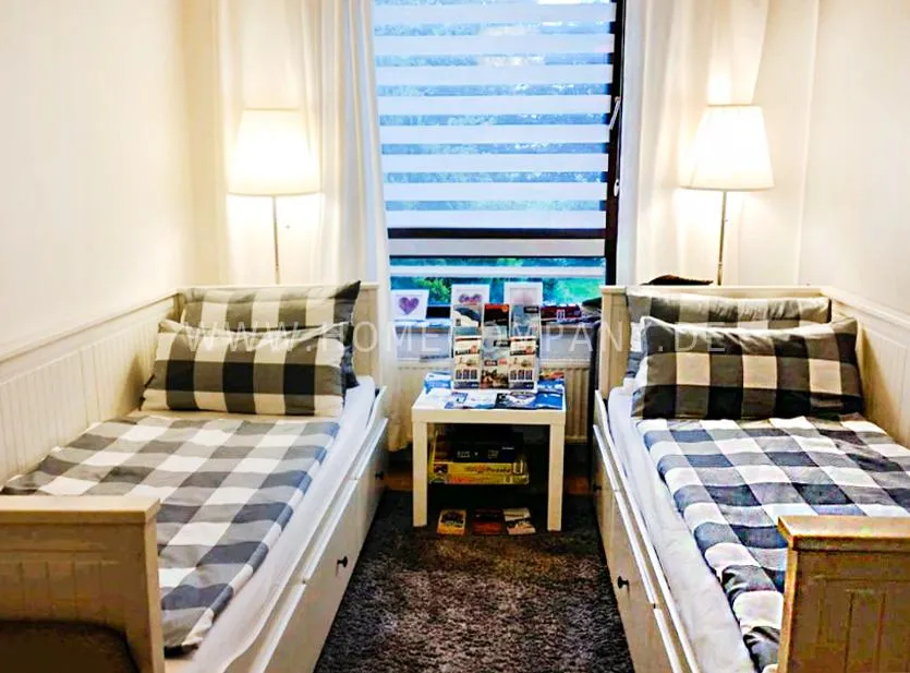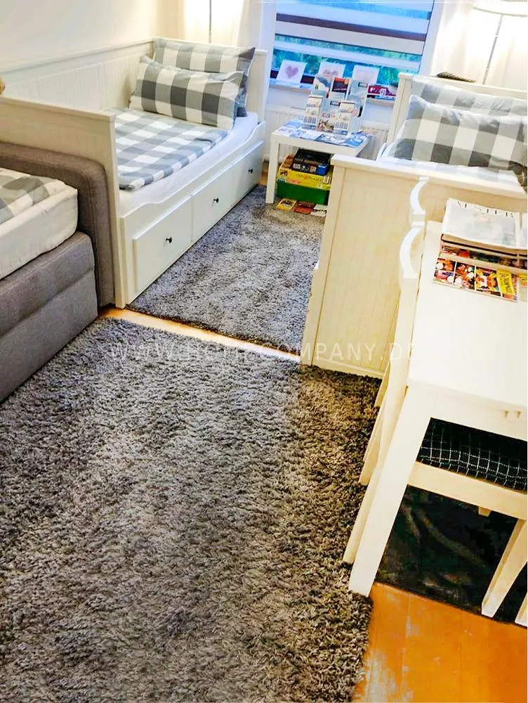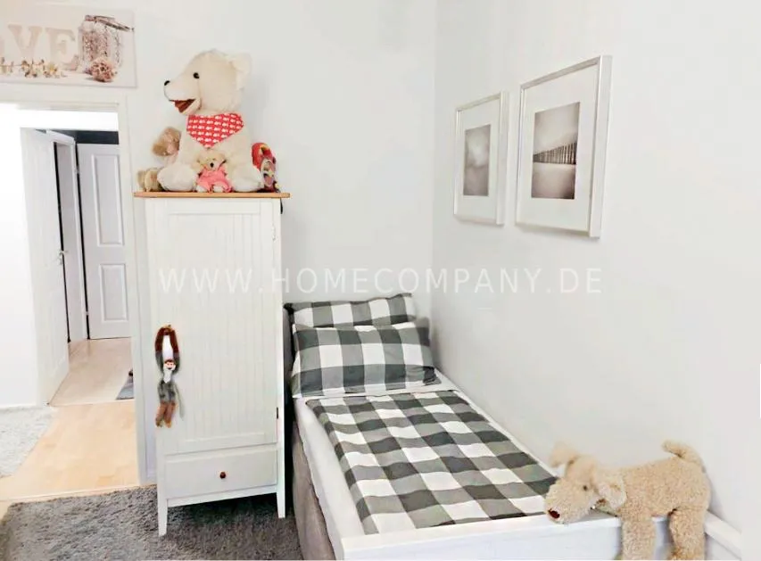 The flat is in a good residential area very close to the Alster. It has a living room, a bedroom with a double bed and a children's room with three single beds. All rooms can be reached from the dining room in the middle of the apartment.