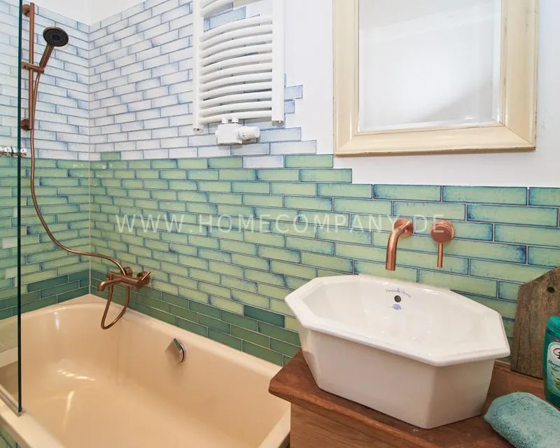 The bathroom has an individual design and includes a bathtub, ideal for relaxing. A separate WC is also available.