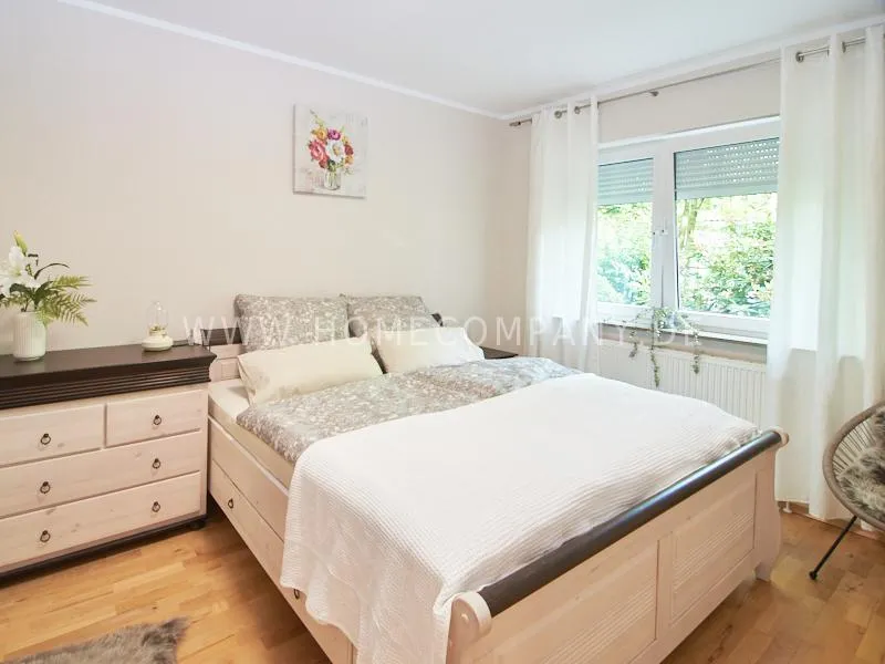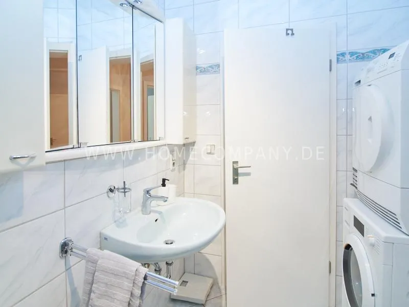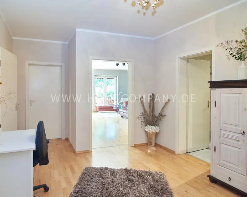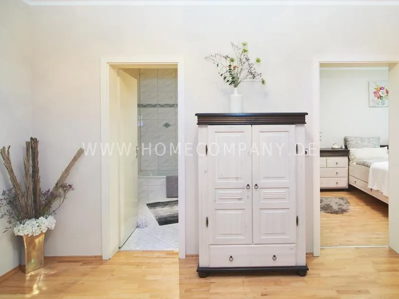 The bedroom is equipped with a double bed and plenty of closet space. In the spacious entrance area there is a space for the home office. In addition to the bathroom, which is equipped with a bathtub, there is a separate guest toilet with a shower. In the bathroom there is a Miele washing machine and a separate dryer.