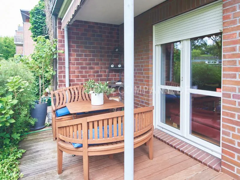 The apartment is located on a quiet residential street. The living room faces the residential complex's green communal garden and has a comfortable sofa area and a dining table with four chairs. There are two round benches and a table on the terrace in front, which is equipped with wooden planks.