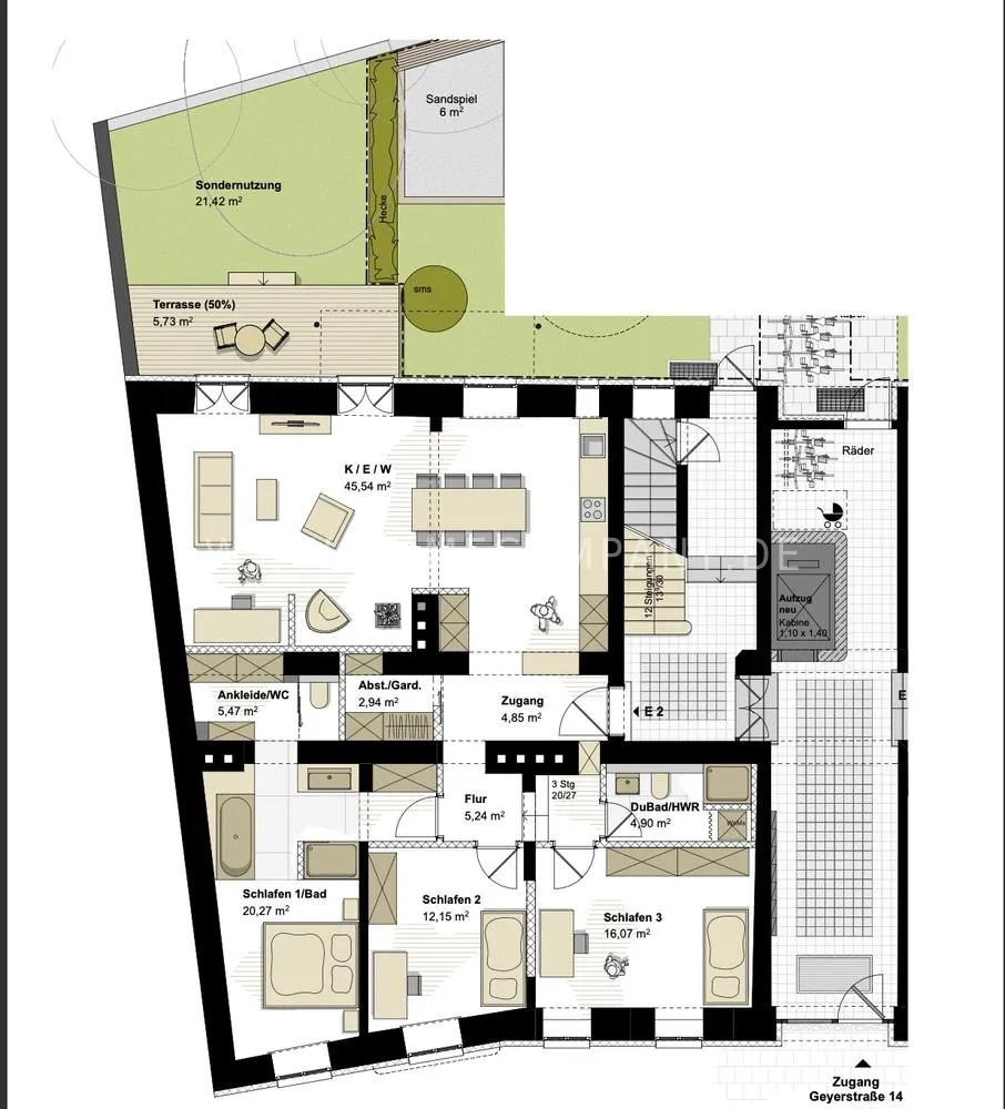 The furnishings impress with their high standard. The centerpiece is the high-quality fitted kitchen, which is both practical and modern in design. A special highlight is the spacious terrace with adjoining garden, idyllically nestled in the surrounding forest—and right in the middle of the city. The apartment also has a good lighting concept and several high-quality custom-made fixtures, as well as a high-quality dressing room by Cabinet.