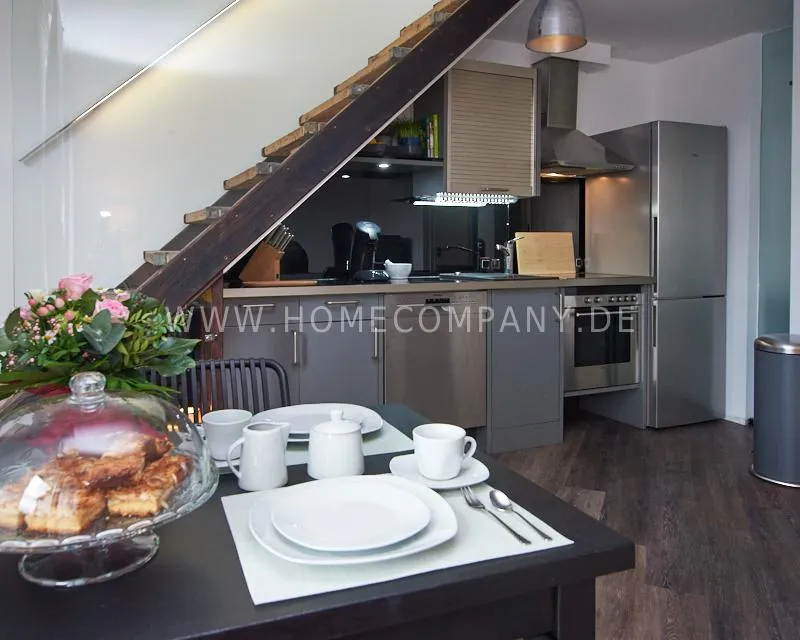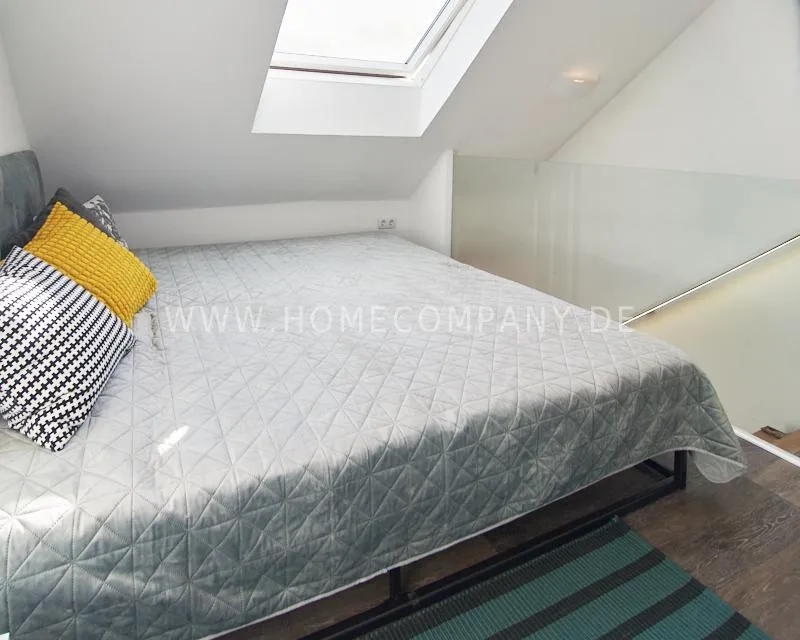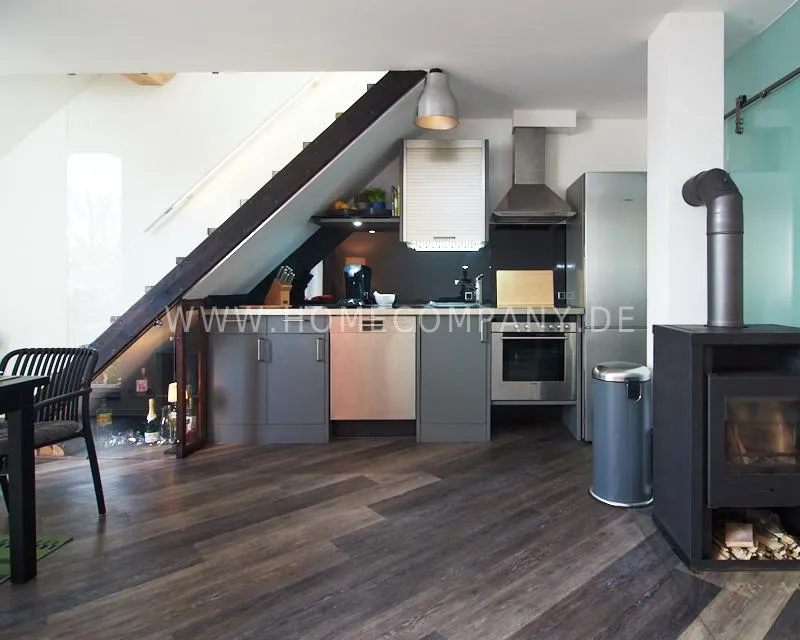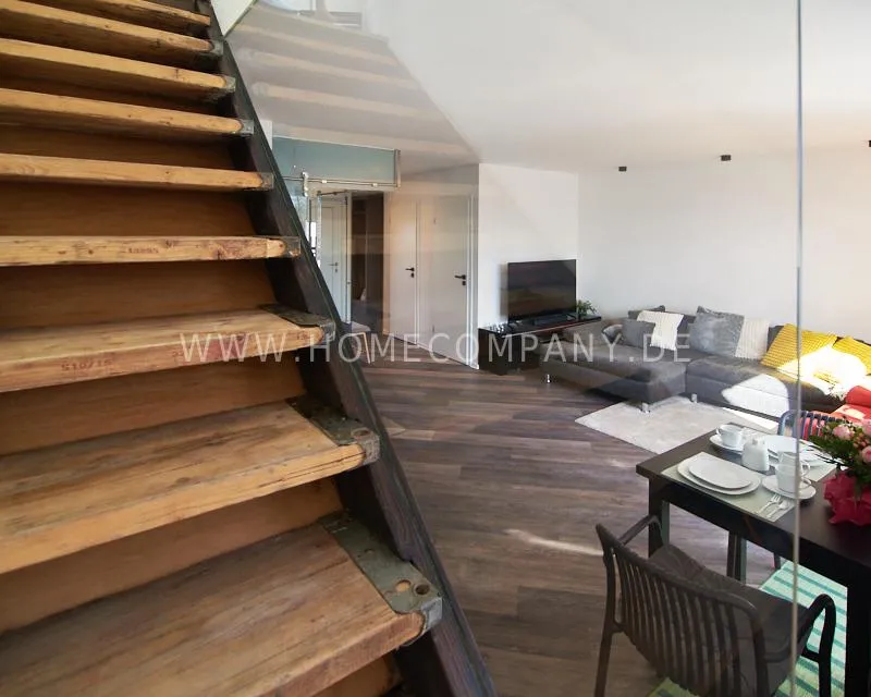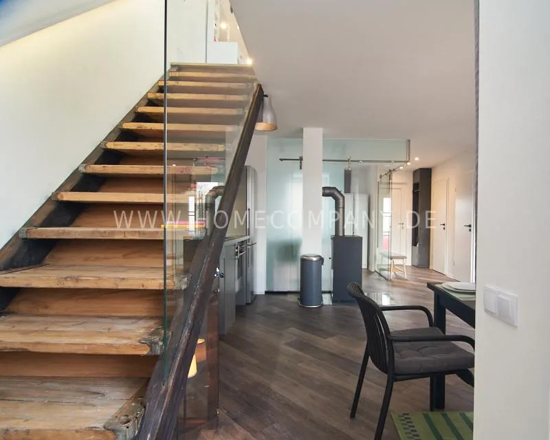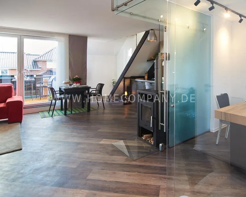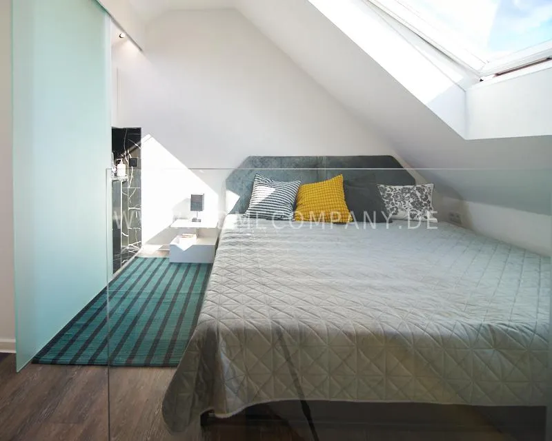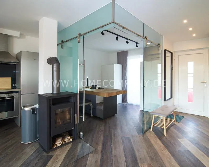 Newly built apartment in a quiet and award-winning residential street in Jenfeld. Single-family houses with beautiful front gardens and a nice, open-minded neighborhood ensure a pleasant living situation. The building, built in 1963, was extensively renovated and expanded in 2024. The apartment, located on the 2nd and 3rd floors, has all the amenities of a new building: floor-to-ceiling windows, underfloor heating, air conditioning and a modern ambience. On the lower level is the spacious living area with fireplace, open kitchen and a dining area. A wine cabinet is available. From the living room you can access the balcony, which is enclosed by walls on three sides like a loggia. A separate area, separated by a sliding glass wall, is ideal as a home office. The attractively designed shower room with a floor-level shower is also located here. Large-format blue tiles contrast excitingly with wood-look tiles. Also on the lower level is a small utility room with the washing machine and a separate dryer. A small side room off the living room offers the perfect storage space for a vacuum cleaner and ironing board. On the upper level there is the bedroom, which is equipped with a 1.80m wide bed, and an adjacent area with shelves. There is also a spacious bathroom with a bathtub, designed in black tiles, with a bathtub set into the floor, separated by a glass wall. The apartment offers fast internet (50 Mbit) and a smart TV, on which both the standard programs can be received and a set-up Netflix account can be used. A balcony power plant ensures sustainability.
