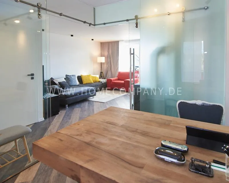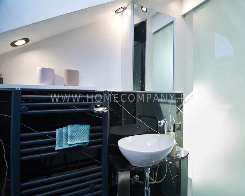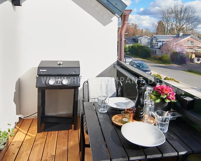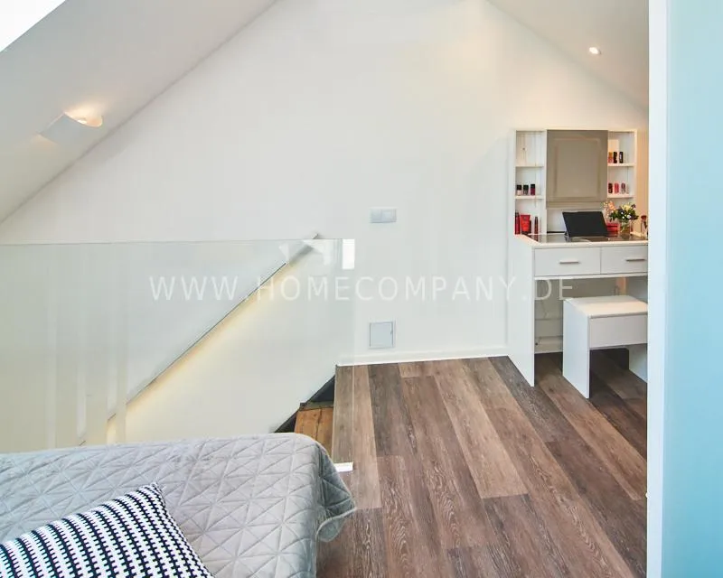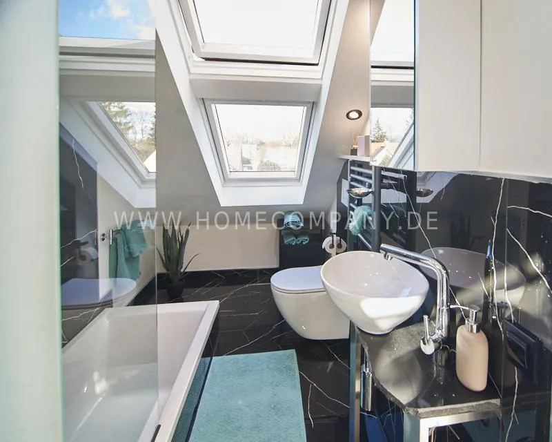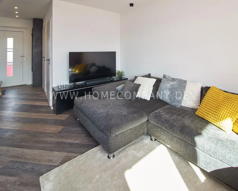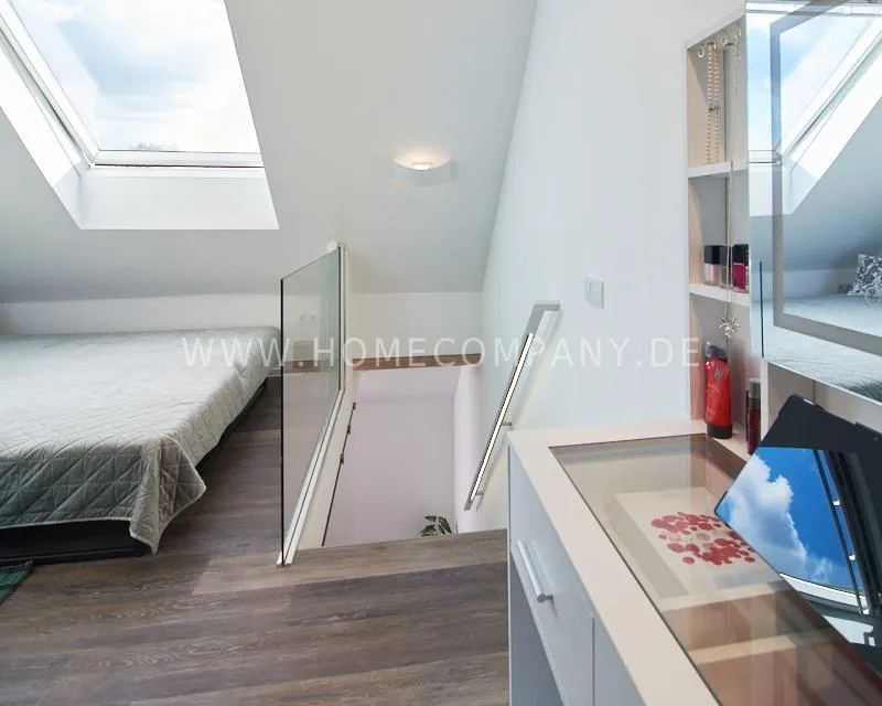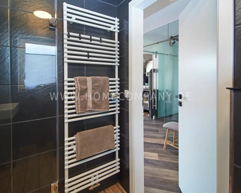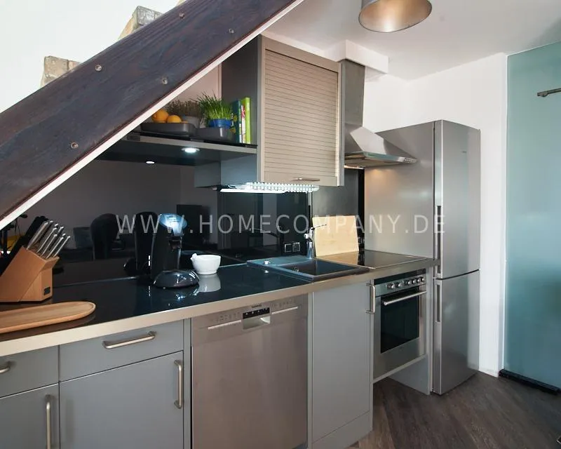 Newly built apartment in a quiet and award-winning residential street in Jenfeld. Single-family houses with beautiful front gardens and a nice, open-minded neighborhood ensure a pleasant living situation. The building, built in 1963, was extensively renovated and expanded in 2024. The apartment, located on the 2nd and 3rd floors, has all the amenities of a new building: floor-to-ceiling windows, underfloor heating, air conditioning and a modern ambience. On the lower level is the spacious living area with fireplace, open kitchen and a dining area. A wine cabinet is available. From the living room you can access the balcony, which is enclosed by walls on three sides like a loggia. A separate area, separated by a sliding glass wall, is ideal as a home office. The attractively designed shower room with a floor-level shower is also located here. Large-format blue tiles contrast excitingly with wood-look tiles. Also on the lower level is a small utility room with the washing machine and a separate dryer. A small side room off the living room offers the perfect storage space for a vacuum cleaner and ironing board. On the upper level there is the bedroom, which is equipped with a 1.80m wide bed, and an adjacent area with shelves. There is also a spacious bathroom with a bathtub, designed in black tiles, with a bathtub set into the floor, separated by a glass wall. The apartment offers fast internet (50 Mbit) and a smart TV, on which both the standard programs can be received and a set-up Netflix account can be used. A balcony power plant ensures sustainability.