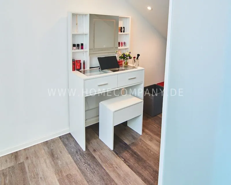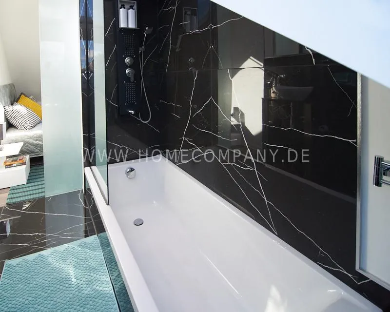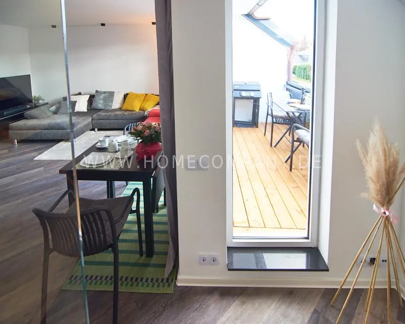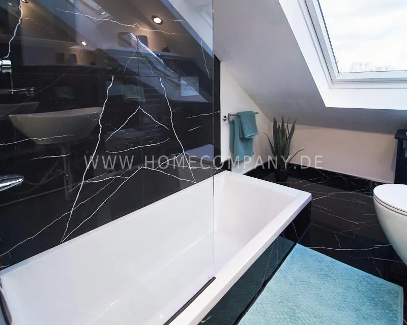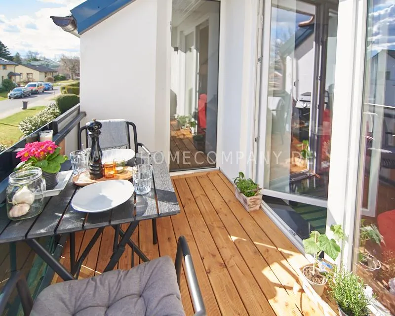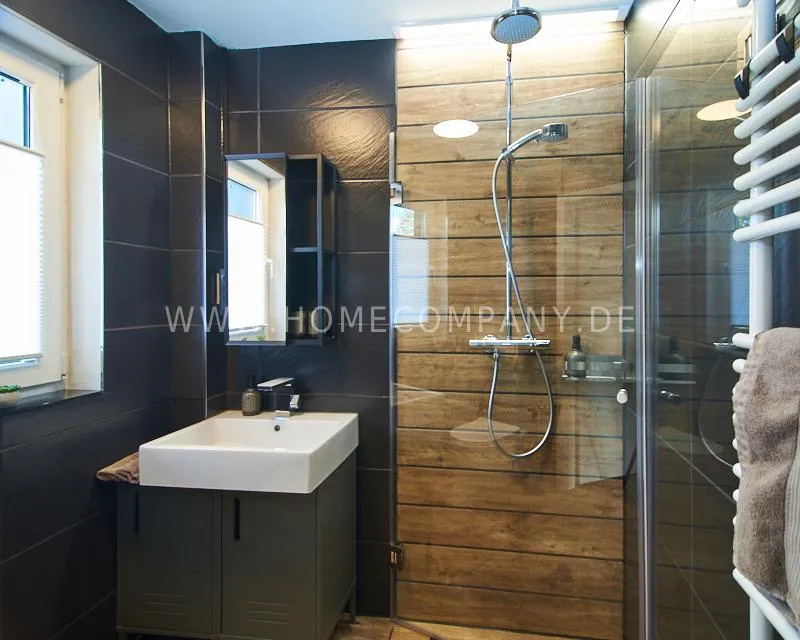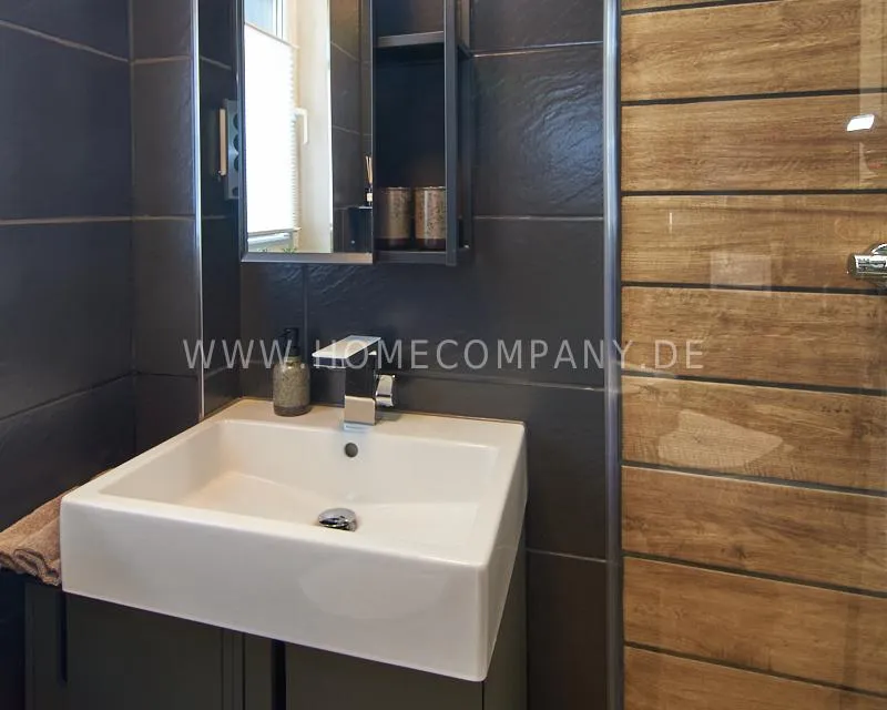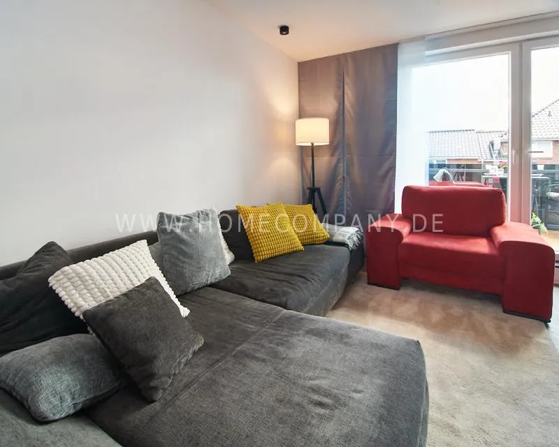 Newly built apartment in a quiet and award-winning residential street in Jenfeld. Single-family houses with beautiful front gardens and a nice, open-minded neighborhood ensure a pleasant living situation. The building, built in 1963, was extensively renovated and expanded in 2024. The apartment, located on the 2nd and 3rd floors, has all the amenities of a new building: floor-to-ceiling windows, underfloor heating, air conditioning and a modern ambience. On the lower level is the spacious living area with fireplace, open kitchen and a dining area. A wine cabinet is available. From the living room you can access the balcony, which is enclosed by walls on three sides like a loggia. A separate area, separated by a sliding glass wall, is ideal as a home office. The attractively designed shower room with a floor-level shower is also located here. Large-format blue tiles contrast excitingly with wood-look tiles. Also on the lower level is a small utility room with the washing machine and a separate dryer. A small side room off the living room offers the perfect storage space for a vacuum cleaner and ironing board. On the upper level there is the bedroom, which is equipped with a 1.80m wide bed, and an adjacent area with shelves. There is also a spacious bathroom with a bathtub, designed in black tiles, with a bathtub set into the floor, separated by a glass wall. The apartment offers fast internet (50 Mbit) and a smart TV, on which both the standard programs can be received and a set-up Netflix account can be used. A balcony power plant ensures sustainability.